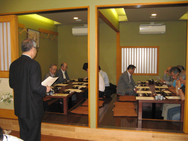 最後は福元会長のエール、出席者全員で肩を組み「グレーター立命」を高らかに歌いお開きとなりました。 21:00 は別室で二次会となり、40人余りの校友が更に懇親を深める場となりました。 二次会終了後、三次会、四次会と進んだ組もあったようで、ヨカ晩でした。
