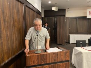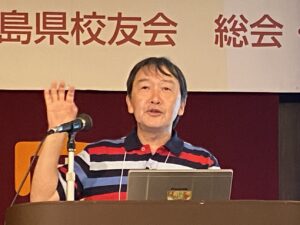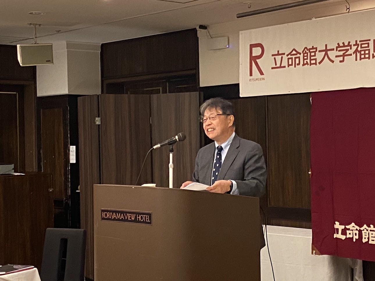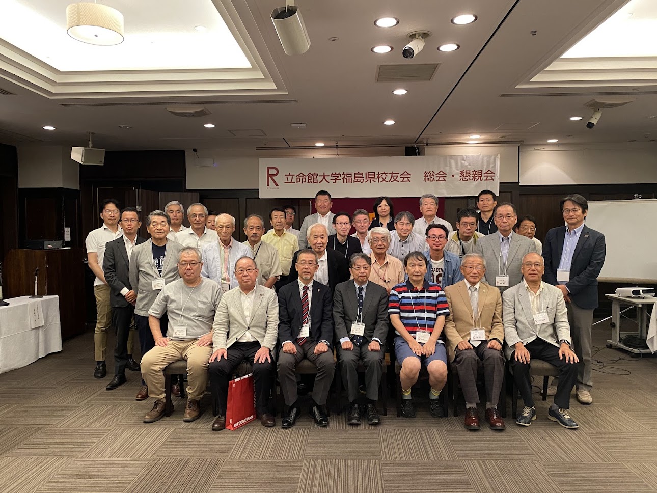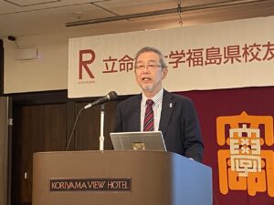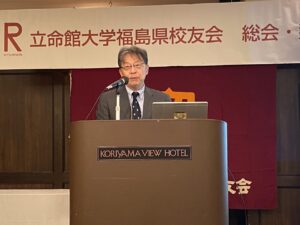 総会は宗形一秀氏(’89法)の味わい深い司会で進められ、校歌斉唱の後、会長の飯塚 俊二氏(’81法)が挨拶に登壇され、震災から15年が経ち復興が進む中、沿岸部での取り組みが長期化するなどの課題もでている。その中でも立命館大学からの支援やつながりが福島県の皆さんに希望を与えていると、立命館ならびに校友会への感謝を述べられました。続いてが来賓として、サトウタツヤ学校法人立命館副総長、立命館大学副学長、総合心理学部学部長よりご自身と福島の関係、参加されていた中井勝巳元福島大学学長(‘78院法修・公法)とのご関係、ご自身が指導するゼミ(サトゼミ)との関係などを交えて、ご挨拶され、立命館大学校友会柴田順夫副会長からは、校友会の近況や、未来人材育成基金での学生の支援などに触れ、校友会の活動についてもお話がありました。