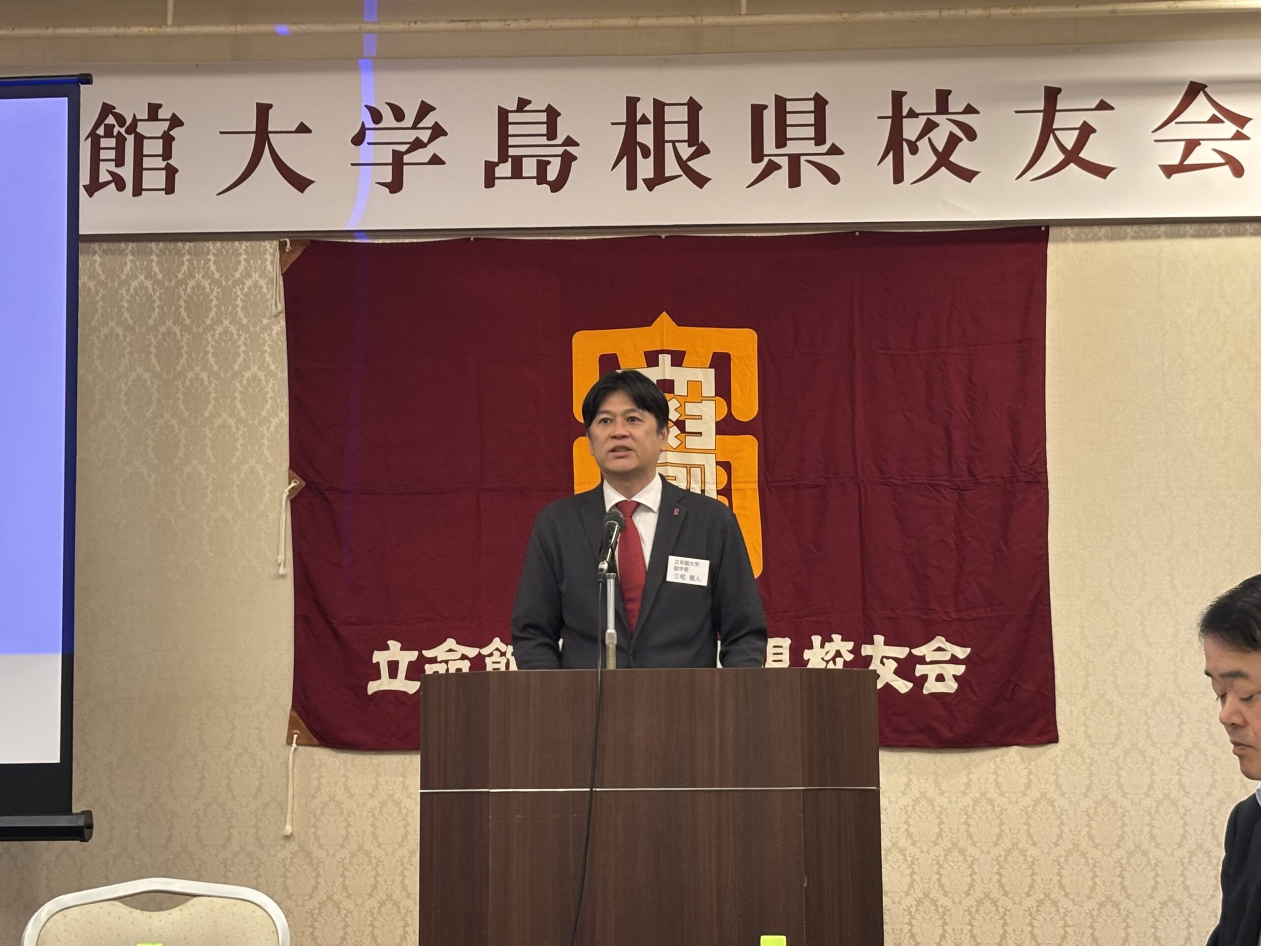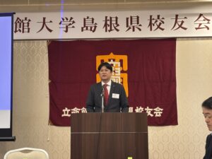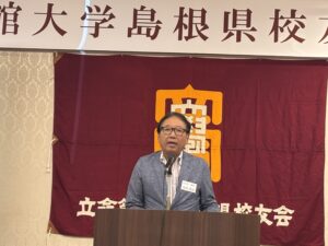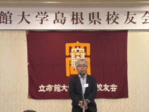 次に主催者を代表し、岡本隆志会長(‘81産社)より、「『立命館がすごい(西山昭彦著)』という書籍の紹介し、立命館の活躍が喜ばしい!また、体育会男子ホッケー部の活躍によりSelrio島根との対戦が楽しみ。出雲駅伝は来年の出場を期待している。」とのご挨拶があった。