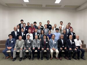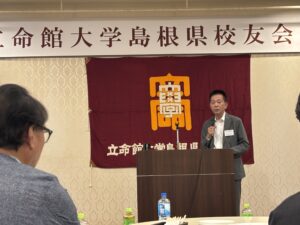 2025年9月20日(土)午後2時から、松江市のサンラポーむらくもにおいて、「第54回立命館大学島根県校友会総会」が開催され、来賓含め35名が出席した。第Ⅰ部 総会は、和田裕之事務局長(‘93経営)の司会により開会され、まず最初に全員で校歌斉唱を行った。
