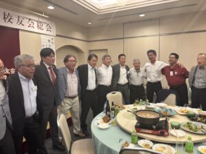 懇親会は、原順一副会長・出雲支部長(‘77理工)による乾杯の発声により開宴となり、岡本会長の進行の下、初参加の校友の挨拶等々が行われ、最後は、全員で円陣を組んでグレーター立命を斉唱した。