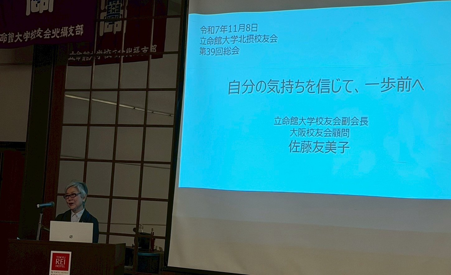 次に、講演会に移り、立命館大学校友会副会長で大阪校友会顧問(前会長)の佐藤友美子氏(‘75文卒)により、「自分の気持ちを信じて、一歩前へ」というテーマで、立命館大学卒業後に就職したサントリー株式会社で「仕事が楽しい」と感じたものの、理科系職場へ異動になり悩んだことや、佐治敬三会長が初代所長の不易流行研究所の設立に関わり、自由な気風の中で活躍された様々なエピソードを披露されました。
