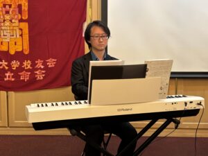 第3部は尾上 劉次 姫路立命会会長('85経済)の挨拶と、水田 宗人 兵庫県校友会相談役('71産社)の乾杯で始まった懇親会が行われました。橋詰 智博('13経済)氏のピアノ演奏とゲストの岡田 麻里絵様の歌に彩られ、和やかに進行しながら親睦を深めました。終盤には応援歌「グレーター立命」を皆で合唱し、姫路市議会議員議長の石堂 大輔('99法)氏の万歳三唱、久内 麻佐行('80法)氏の中締めで「総会・校友のつどい」はお開きとなりました。