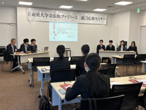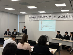 奈良県校友会の中尾卓矢氏(’10経済)の司会進行により、来賓および主催者紹介の後、奈良県校友会の柴田 順夫会長('81経営)が挨拶を行った。まず立命館大学キャリアセンターの船尾優一課長補佐が就職活動におけるスケジュールや立命館大学の進路・就職の概況について説明し、その後、奈良県庁、奈良市役所、南都銀行、奈良県警察の若手校友による就職活動体験報告が行われた。若手校友の中には、在学時にファミリー会に参加し、個別相談をしたことがきっかけで就職先のOBと繋がった校友もおり、まさに循環型の支援文化が醸成されている。セミナー後には個別相談が行われ、学生からも積極的な質問が寄せられた。