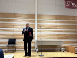 「奈良県ファミリー会」と並行し2025年度奈良県校友会総会が開催され、第一部の総会では約120名が参加した。株式会社京都放送 宮本英樹アナウンサー(’84産社)の司会進行でスタート。黙祷・校歌斉唱の後、柴田順夫会長より開会挨拶があった。続いて、飛鳥井雅和立命館大学校友会顧問(’64法)より来賓挨拶では、11月23日の校友会設立記念日や校友会の成り立ちに触れ、母校へのさらなる支援呼びかけがあった。議事では、柴田順夫会長を議長に、田中敦事務局長(’88経営)より2024年度活動報告・収支監査報告、2025年度活動計画・予算案が報告され、いずれも拍手をもって承認された。