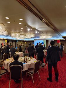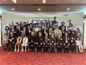 引き続き、懇親会に入り、天野由紀さん(‘14 APU)の進行により、宮迫会長の挨拶、来賓ご紹介と進んだ。来賓の立命館大学:伊坂忠夫副学長、立命館アジア太平洋大学:淺野昭人副学長、(公財)大学コンソーシアム京都:廣井徹副事務局長、立命館大学校友会:飯田俊之副会長、同志社校友会大分県支部:後藤知弘副支部長、同:樋口昌平事務局長のご紹介に続き、県外よりお越しいただいた香川県校友会:森繁樹幹事(’02産社)、岡本崇宏幹事(‘11APU)、福岡県校友会:三上由佳副会長(’96産社)、八納正英幹事長(‘90経営)、宮崎県校友会:梶井勇輝さん(’17産社)をご紹介した。