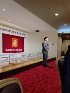 続いて、関西から離れた大分県の校友は、卒業してからは大学と疎遠になってしまうため、立命館大学・APUの“今”を知っていただきたく、昨年より企画した「オープンキャンパスat大分県校友会」今年は伊坂忠夫副学長(スポーツ健康科学部教授)に「Well-Beingの実現に向けて立命館が展開するスポーツと身体圏研究」と題し、大学の研究が社会とどうつながっているのかを中心にご講演いただいた。