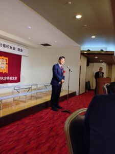 総会は利光隆治幹事長(‘89経営)の司会で進行し、昨年末ご逝去された江熊一之副会長(’69文)をはじめとする物故者への黙とう、校歌斉唱の後、宮迫敏郎会長(’82経済)が挨拶を行った。その後、議事に入り、綱木深雪事務局長(‘98文)より令和6年度の事業報告、和田徹二郎会計幹事(’01経済)より会計報告、深田宏会計監査(‘77法)より会計監査報告、綱木事務局長より令和7年度の事業計画・予算案の提案と進み、議事は承認された。今年は役員改選の年であり、宮迫会長からの提案の通り承認された。