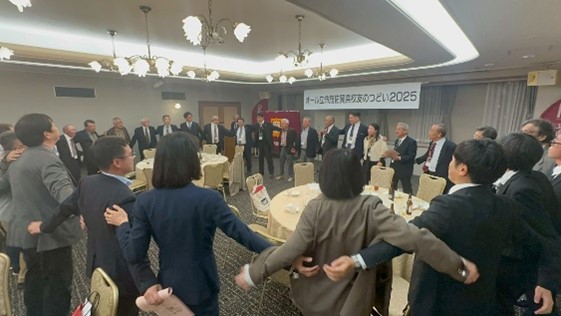 宴もたけなわとなったころ、参加者全員で輪になり、応援歌「グレーター立命」を熱唱し、伊香賀俊介氏('74産社)の万歳三唱で中締めとなりました。