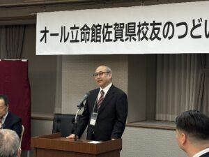 続いて梅田 一成会長('80経営)が挨拶に立ち、33回を迎えた「佐賀県青春寮歌祭」への参加状況について報告されました。今年は立命館から12名が参加したものの、年々参加者が減少しており「だんだん寂しくなっている」と率直な課題意識を示されました。