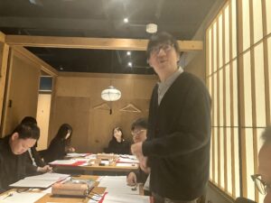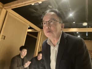 懇親会では、島根県校友会の岡本会長からご提案のあった校友も所属しているホッケーチームSelrio島根と母校との試合の応援企画等、山陰地方の3校友会の連携事業に向けた話や、2026年6月27日に米子市での開催が予定されている中四国ブロック会議の話等で活発な意見交換が行われました。最後は黒須則典氏(’69年理工)のリードで応援歌を斉唱し、中締めとなりました。