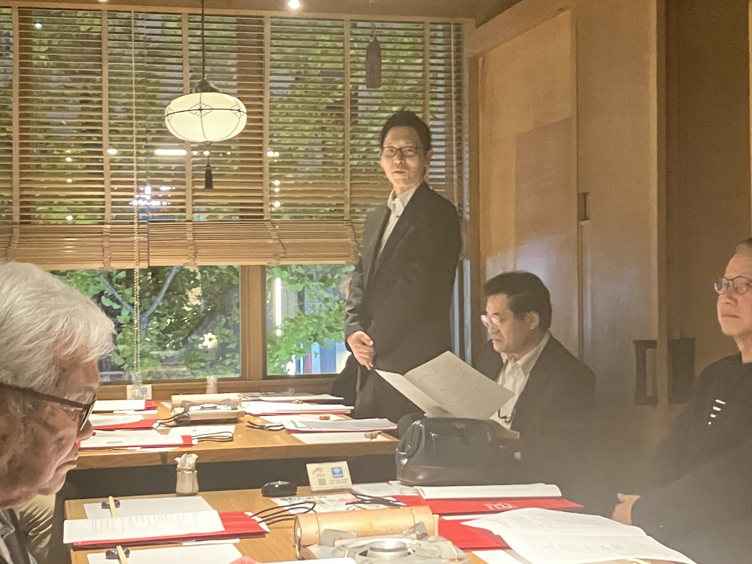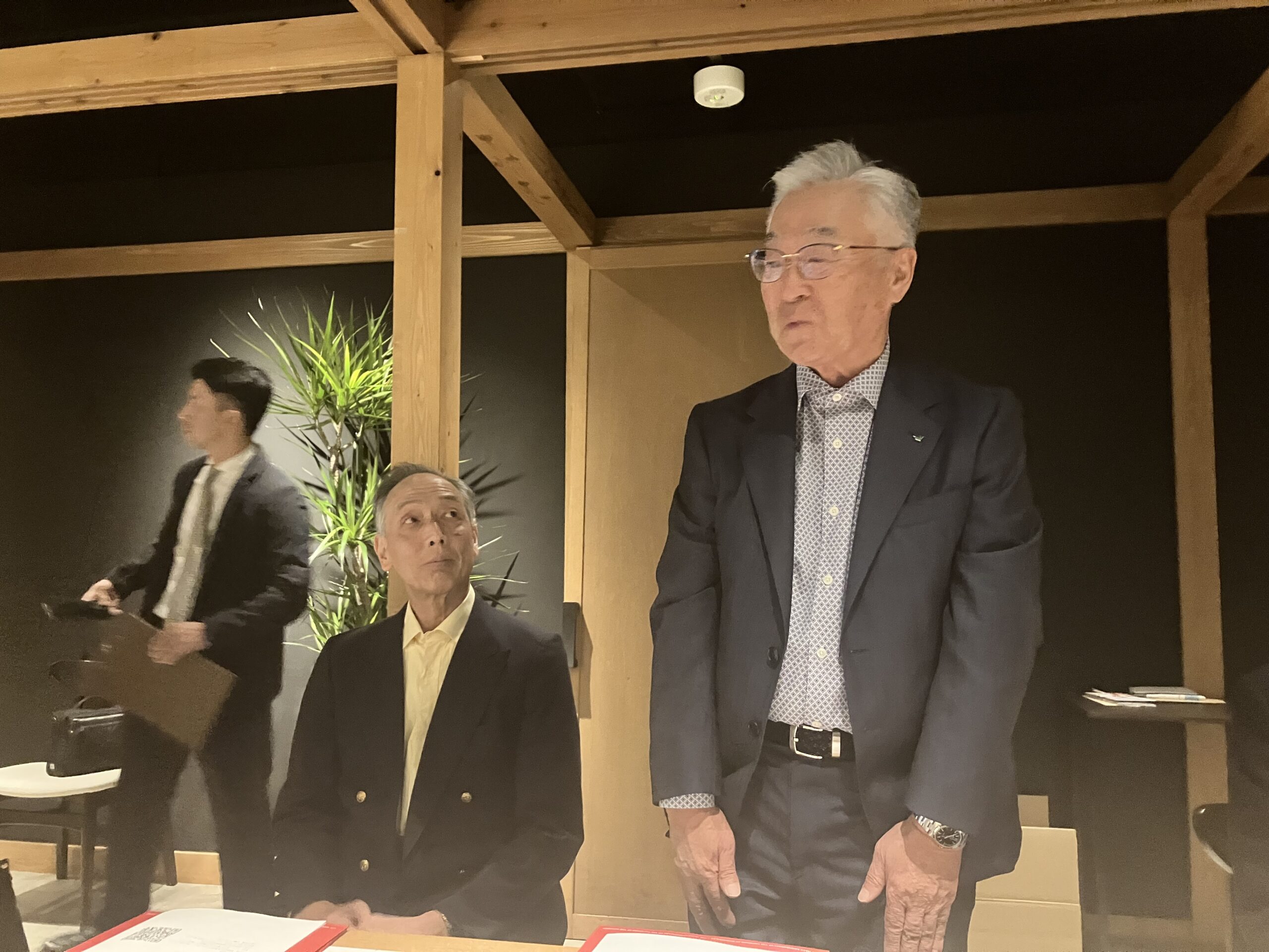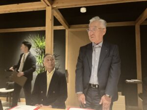 懇親会では、島根県校友会の岡本会長からご提案のあった校友も所属しているホッケーチームSelrio島根と母校との試合の応援企画等、山陰地方の3校友会の連携事業に向けた話や、2026年6月27日に米子市での開催が予定されている中四国ブロック会議の話等で活発な意見交換が行われました。最後は黒須則典氏(’69年理工)のリードで応援歌を斉唱し、中締めとなりました。