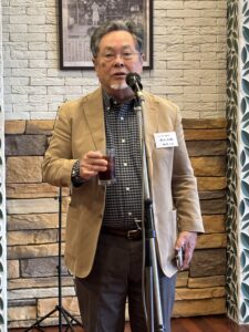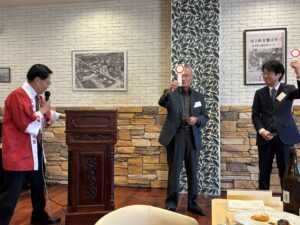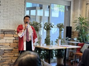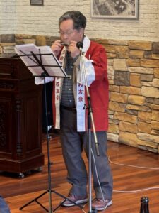 明るい陽光が差し込む会場は心地好く、参加者はホテルの美味な料理を楽しみながら会話も弾み、暫くして始まった清弘顧問によるハーモニカ演奏が一気に会場の温もりを増した。76歳から始めてまだ数年も経たないので気恥ずかしい、と仰いながらも複数のハーモニカを上下左右に吹き吸い分けられるその高度な技術に会場の参加者は感嘆しきりで、穏やかでホッと安堵できる音色に酔いしれて大きな歓声と拍手に包まれた。