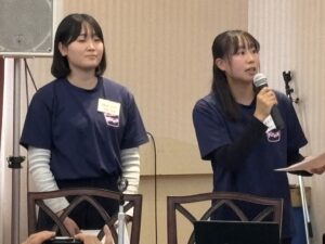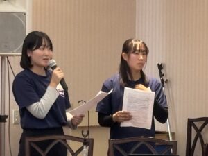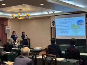 その基金のおかげで精力的に活動をおこなっている立命館大学農業・園芸サークル「きぬがさ農園Kreis」の産業社会学部3回生の学生(篠原茉凛さん、梅垣ほのかさん)が画像を駆使しながら成果報告をおこなった。同団体は2020年3月に衣笠キャンパスで創設され、現在約85名が所属。落ち葉をゴミとして捨てるのはもったいないという意識から、落ち葉を腐葉土にするという問題解決型取り組みを推し進め、今年度は「世界各国の花で人々を笑顔に!!」をテーマに、また地域食堂で地産地消の輪でつながるワークショップで地域との繋がりを強化するといった時宜にかなった魅力あふれる活動を紹介し、会場の参加者はメモをとり感嘆の声をあげていた。終了後の時間がない中でも挙手する校友も後を絶たず、学生2名に温かい大きな拍手が送られた。