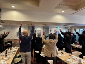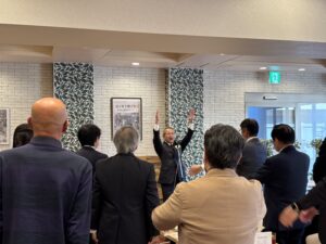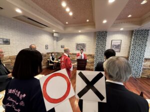 懇親会半ばにはアトラクション企画として豪華景品をめざすオークション、立命館クイズも始まり、森島事務局長の巧みな進行もあり笑顔と笑い声で熱気は溢れた。和やかな交流・懇親が進められ宴もたけなわとなった頃、立命館大学校友会事務局の布施亮介参与がこれから正念場を迎える大学スポーツの明るい話題に触れた後、全員が呼吸を合わせて万歳三唱を発声しお開きをとなった。