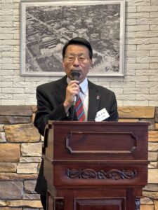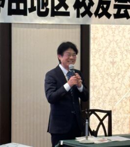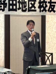 来賓紹介の後、大学を代表して学校法人立命館総合企画部の太田 猛部長が祝辞とともに、未来人財育成基金における宇部小野田校友会の貢献度の高さに感謝と敬意を表する旨を述べられた。大学の近況では、10/18に開催された立命館創始155年・学園創立125周年記念式典の模様や学園をあげて取り組んだ大阪・関西万博の話題、またR2030に向けた教育・研究の到達点やスポーツや文芸分野での学生・卒業生の活躍、各キャンパスの近況等を詳しくご報告された。