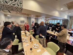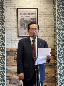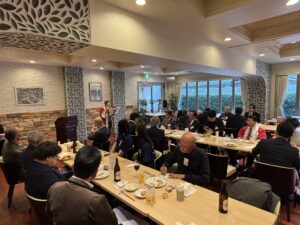 その後全員で写真撮影をおこなった後、懇親会場へと移動した。懇親会ではまず来賓挨拶として校友会代表の立命館大学校友会の初村雅敬常任幹事がマイクを握られ、未来人財育成基金に向けた宇部小野田校友会の持続的かつ積極的な対応や取り組みに重ねて感謝の気持ちを述べられた。次いで立たれたのは、山口地区校友会の清弘和毅顧問('68年経済)。宇部小野田校友会が発展されてきたこれまでの背景や経緯、未来人財育成基金への特筆できる活動、そして中四国ブロック会議の意義や展望に関して多面的なお話をされた後、清弘顧問の高らかな乾杯発声により開宴となった。