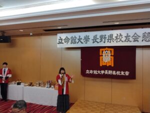 第三部「懇親会」は、梅野文子氏(’78産社)の司会で進行しました。土屋会長の挨拶に続き、群馬県校友会・岩崎明会長('94法)の乾杯発声で開宴しました。宴もたけなわの頃には「抽選会」が行われ、信州の秋の味覚や立命館グッズを受け取った参加者が一言スピーチを述べ、和やかな雰囲気で交流が深まりました。