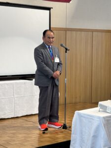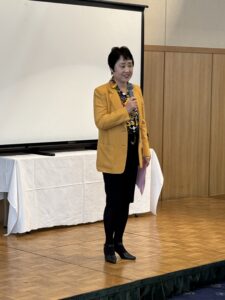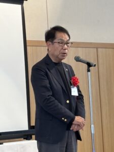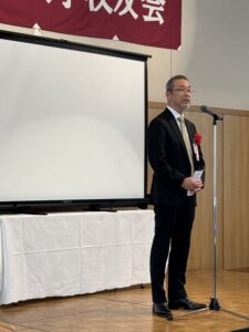 そして壇上には広島県東部校友会 島田斉会長(’79 産社)が壇上に立たれた。公私多忙の中でご参集いただいた来賓と参加者への深謝、今後も楽しく交流をはかれるように校友会活動をおこなっていきたいと述べられ、今回久しぶりに尾道で開催したがレモンやはっさく等の特産物を生かしたお食事、会場から見られる窓外の景色を堪能し楽しんでいただきたいとご挨拶をされた。