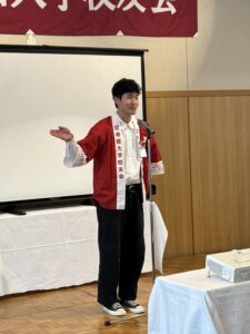 総会議事進行は神原大造幹事長(’83法)が務め、事業報告および会計報告等について拍手を持って全会一致で承認された。続いて校友会を代表し柴田順夫副会長がご挨拶に立ち、今年で13年目を迎える未来人財育成基金の実績をご報告され改めて取り組みに対する御礼を述べられた。学園をあげて取り組んだ大阪・関西万博、10/18に開催された「オール立命館校友の集い」、野球をはじめ学生選手の様々な活躍ぶりも詳しくご紹介された。最後に11月23日は校友会設立記念日である旨も触れられ、今後も学生を支援する同基金へのご協力とご支援を重ねて呼びかけられた。
