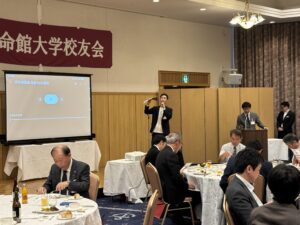 開宴後、公務多忙の中で会場に駆けつけた学校法人立命館の酒井克也常務理事がご登壇。未来人財育成基金への取り組み対する御礼を述べられ、立命館創始155年・学園創立125周年記念式典の模様、R2030に向けた教育・研究の到達点やスポーツ・文芸分野での学生・卒業生の活躍、各キャンパスの近況等を詳しく報告した。