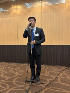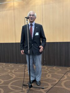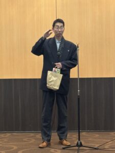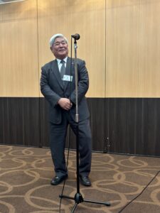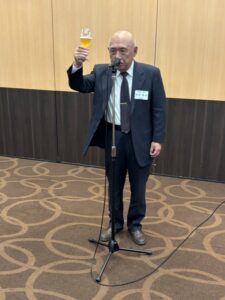 立命館大学校友会からは林 幸雄副会長が登壇され、大盛況だった10月18日(土)の「オール立命館校友の集い2025」の模様をご紹介。オーケストラの演奏をバックにした次期池坊家元のパフォーマンスは圧巻であったと述べられた。また校友会未来人財育成基金の実績をご報告され、10年経過して寄付金は延べ3.7億円に達し学生達の活動を広くサポートしている、と取り組みに対する御礼とさらなるご支援とご協力を呼びかけられた。