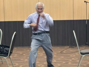 第2部では、サトウタツヤ副総長がわかりやすい画像を駆使され立命館大学の近況をご報告、そして総合心理学部教授のお立場から「今から役立つ心理学」と題する講演をおこなった。人生最初の記憶は?との問いを参加者に投げかけられたり、結晶性知能と流動性知能との違いやデータ等を小さな意味あるまとまりに分類したものを指すチャンク、マズローの5段階欲求、心理的安全、犯罪心理学等、現代にフィットする興味深いテーマやキーワードを、わかりやすい事例やエピソードも盛り込みながらご説明され、参加者は熱心に耳を傾け、これが心理学か、と最後まで感嘆の声を上げてメモをとられていた。