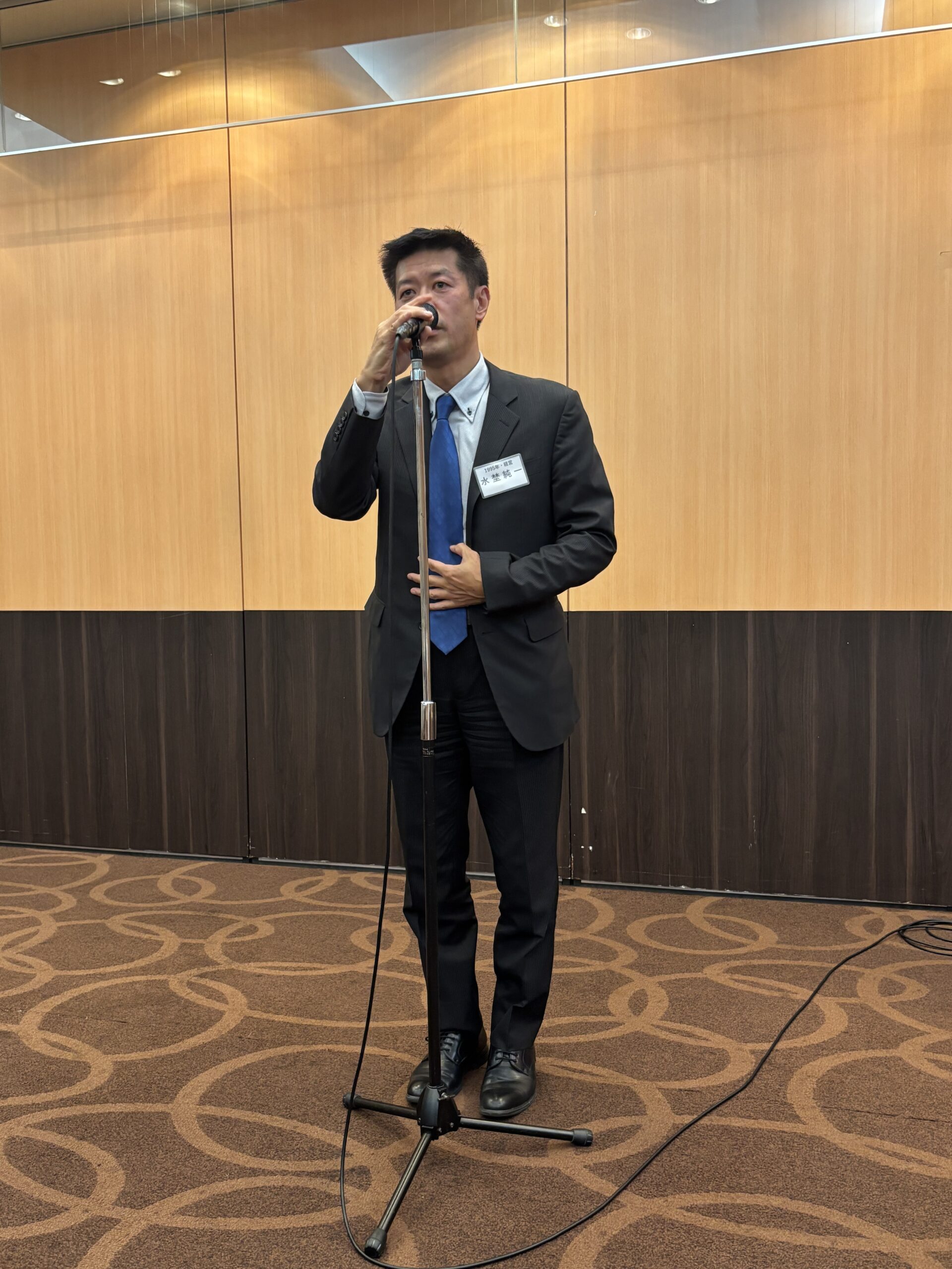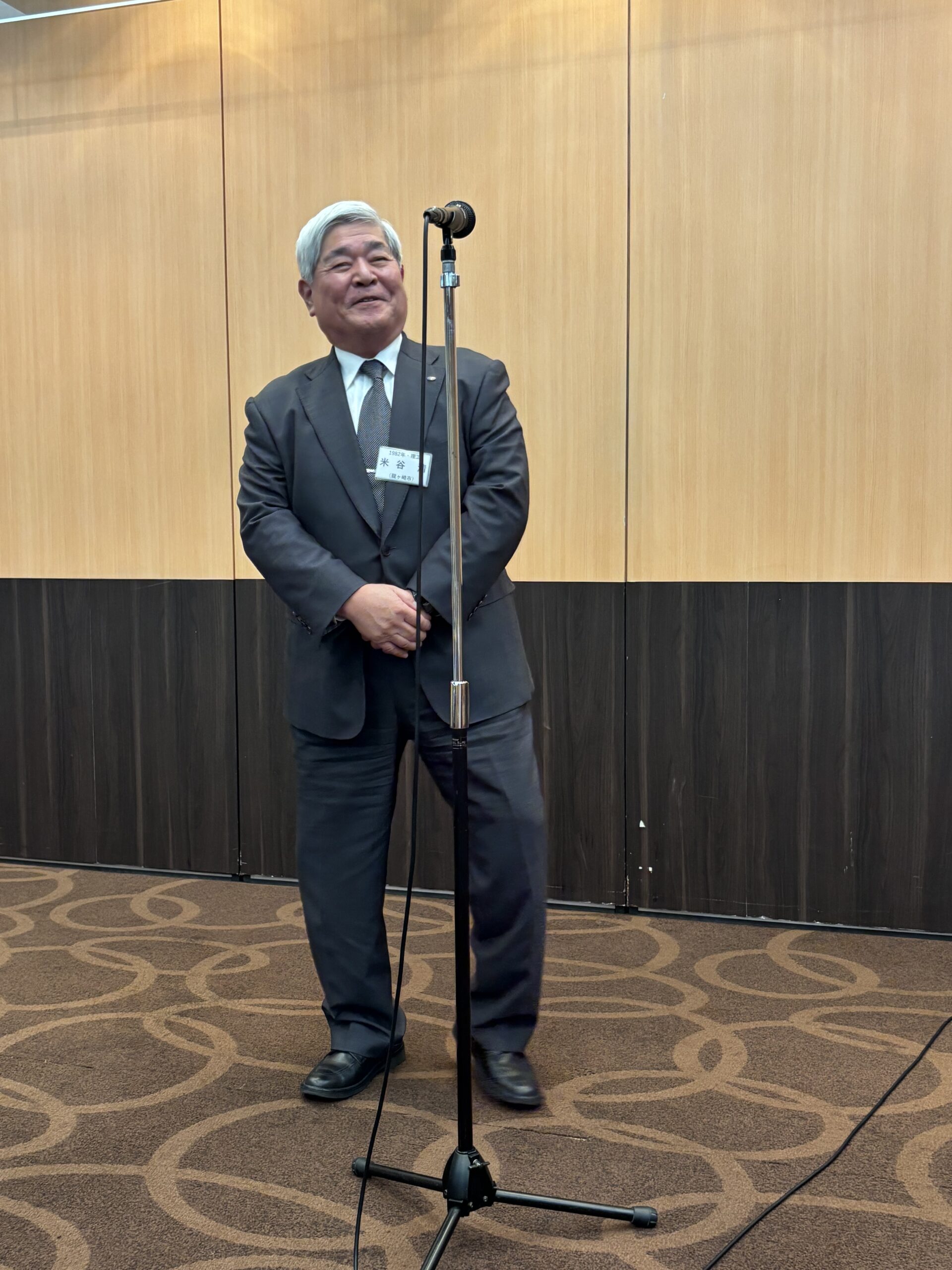 その後、忙しい中を縫って急きょ会場に駆けつけたプロバスケットボールチーム・茨城ロボッツ社の社長で茨城県校友会の川﨑篤之副幹事長('01法)から茨城ロボッツの近況についてご紹介いただき、全員での写真撮影の後、休憩をはさみ懇親会場へと移動した。