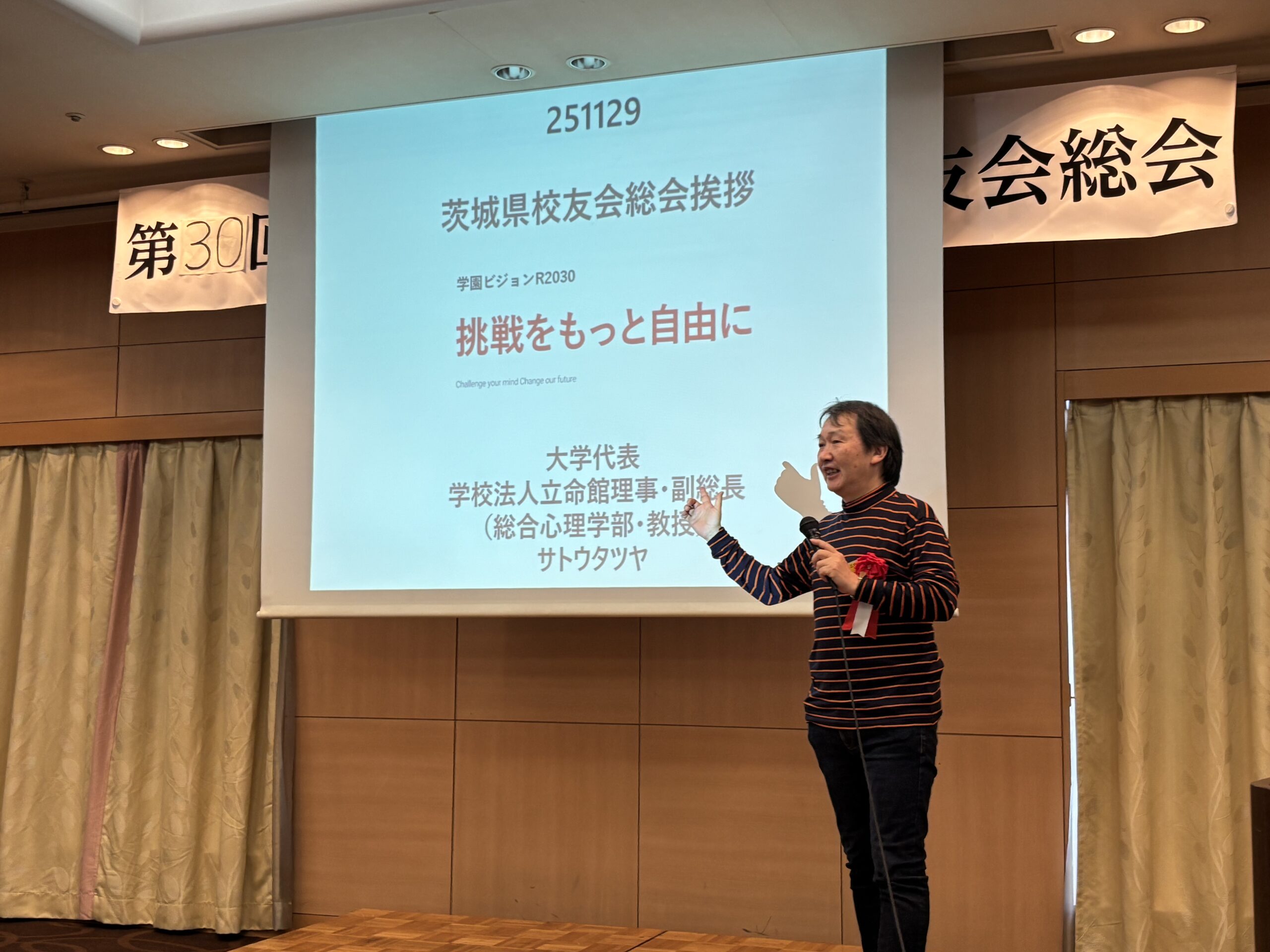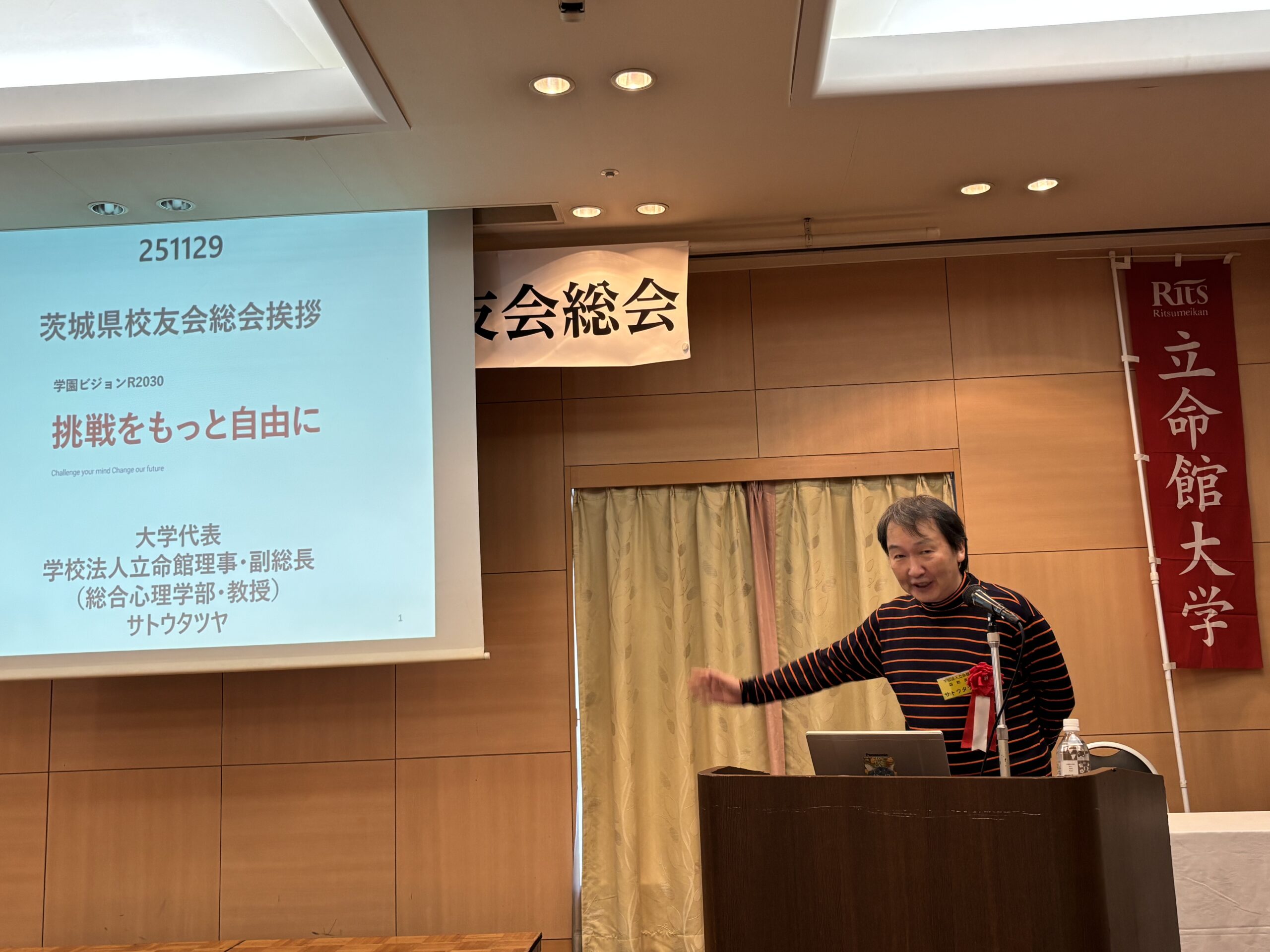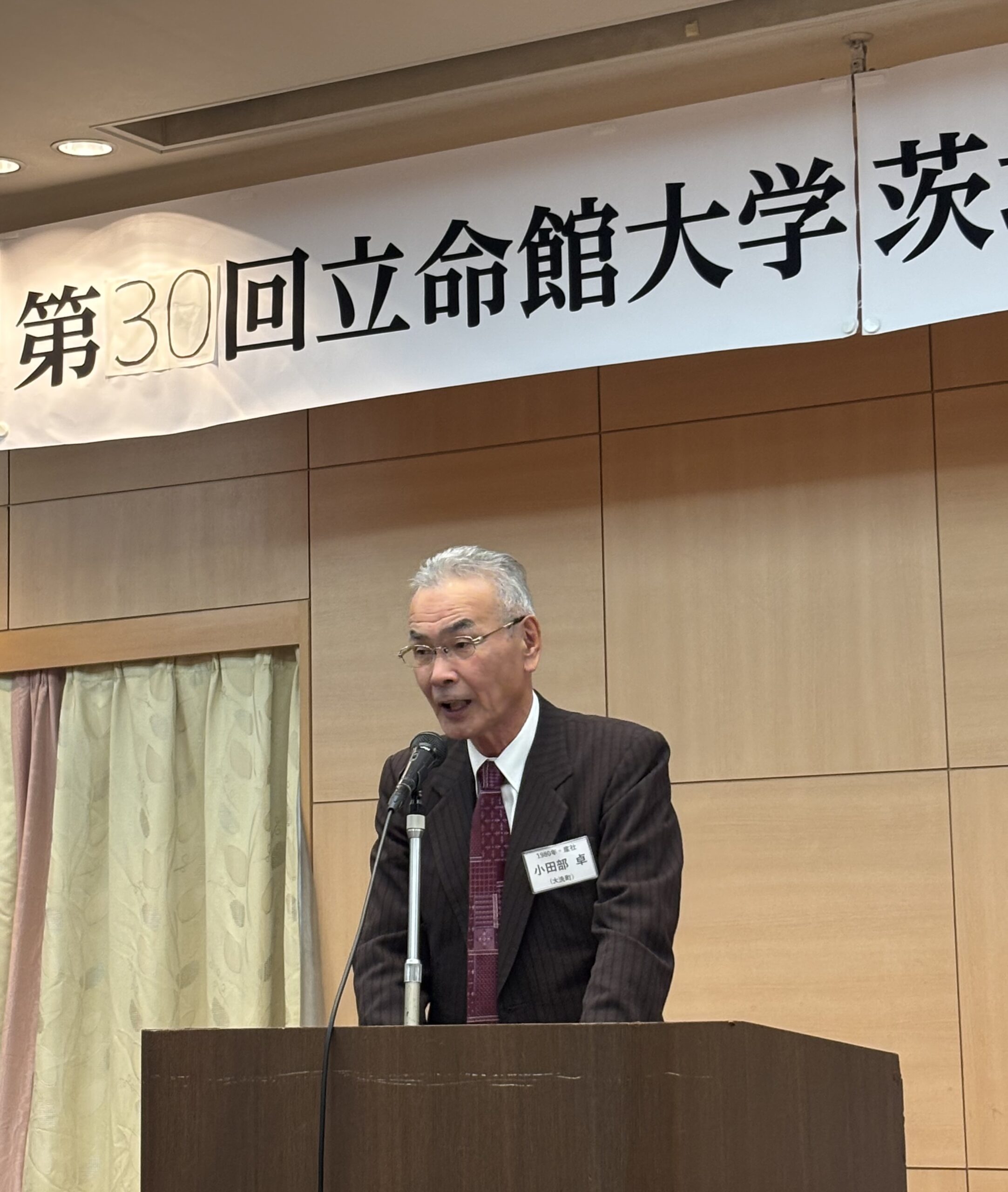 2025年11月29日(土)、茨城県水戸市の水戸三の丸ホテルにおいて、第30回立命館大学茨城県校友会総会・講演会・懇親会が開催された。参加者は来賓11名含めて計24名だった。
