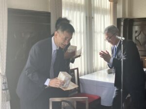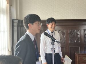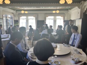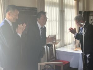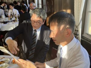 駒淳志幹事(’02理工研)の司会進行で開会した総会は、初めに橋田洋介会長(’89理工)が開会の挨拶を行い、次に校友会事務局から参加した大場が、先日2年連続で甲子園ボウルを制したアメリカンフットボール部や、明治神宮野球大会で準優勝した硬式野球部など学生たちの活躍や、2026年4月に衣笠キャンパスに設置される新学部のデザイン・アート学部・研究科の準備状況等、母校の近況を報告するとともに、さらなる支援と連携をお願いしました。その後、昨年度末をもって同会を退会された松原武司氏(’87理工)と齋藤裕二氏(’87理工)が紹介され、橋田会長から記念品が贈呈されました。そして同会を通じて構築できた人脈が、仕事をしていくにあたって様々な協力を得られたことなど、思い出話を交えながらそれぞれ挨拶を行いました。最後に、決算報告等の総会議事の承認を経て、総会を終了。懇親会へと移行しました。