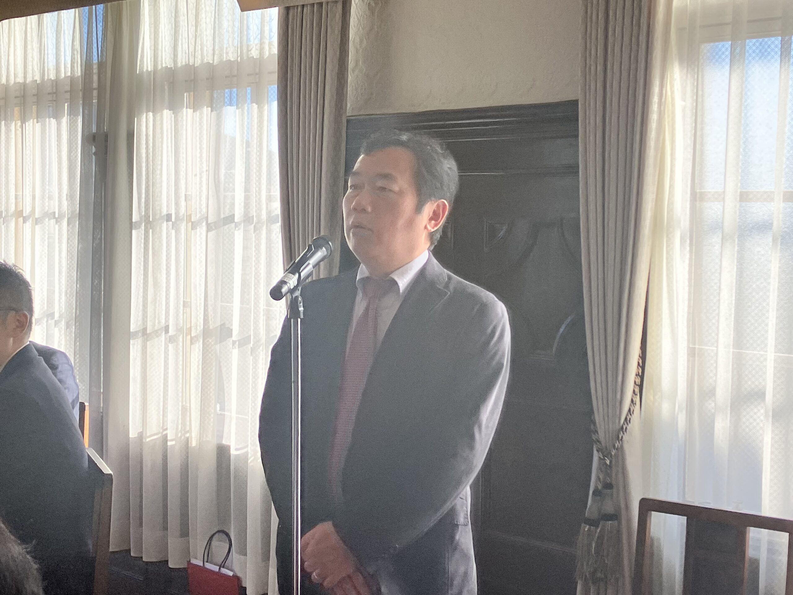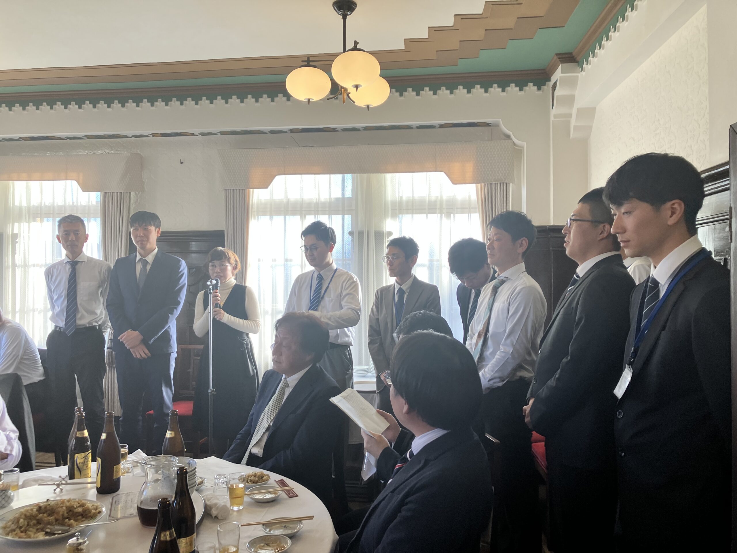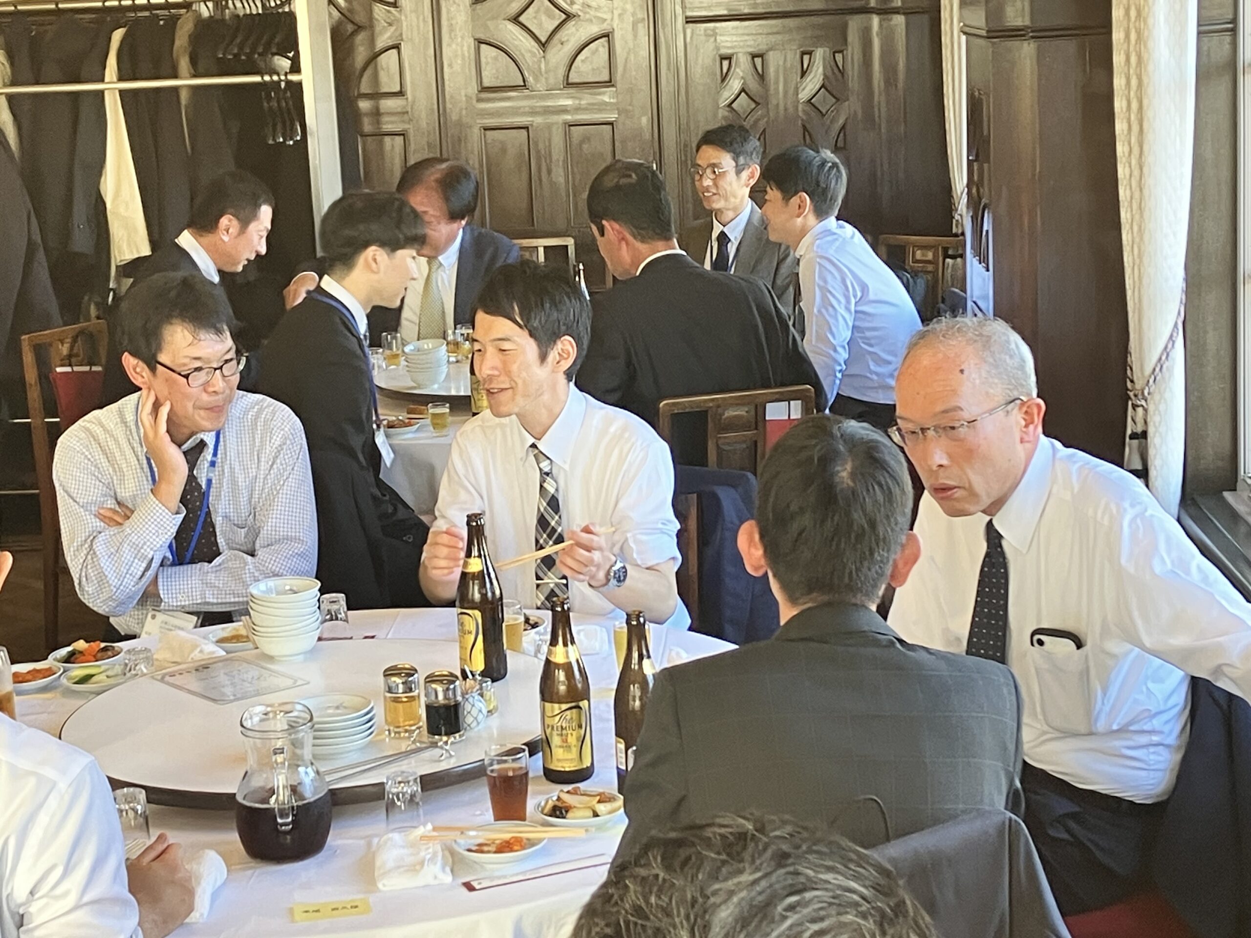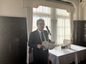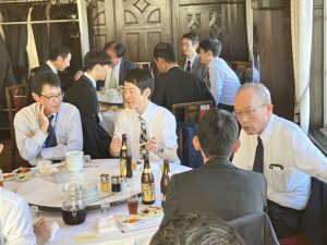 駒淳志幹事(’02理工研)の司会進行で開会した総会は、初めに橋田洋介会長(’89理工)が開会の挨拶を行い、次に校友会事務局から参加した大場が、先日2年連続で甲子園ボウルを制したアメリカンフットボール部や、明治神宮野球大会で準優勝した硬式野球部など学生たちの活躍や、2026年4月に衣笠キャンパスに設置される新学部のデザイン・アート学部・研究科の準備状況等、母校の近況を報告するとともに、さらなる支援と連携をお願いしました。その後、昨年度末をもって同会を退会された松原武司氏(’87理工)と齋藤裕二氏(’87理工)が紹介され、橋田会長から記念品が贈呈されました。そして同会を通じて構築できた人脈が、仕事をしていくにあたって様々な協力を得られたことなど、思い出話を交えながらそれぞれ挨拶を行いました。最後に、決算報告等の総会議事の承認を経て、総会を終了。懇親会へと移行しました。