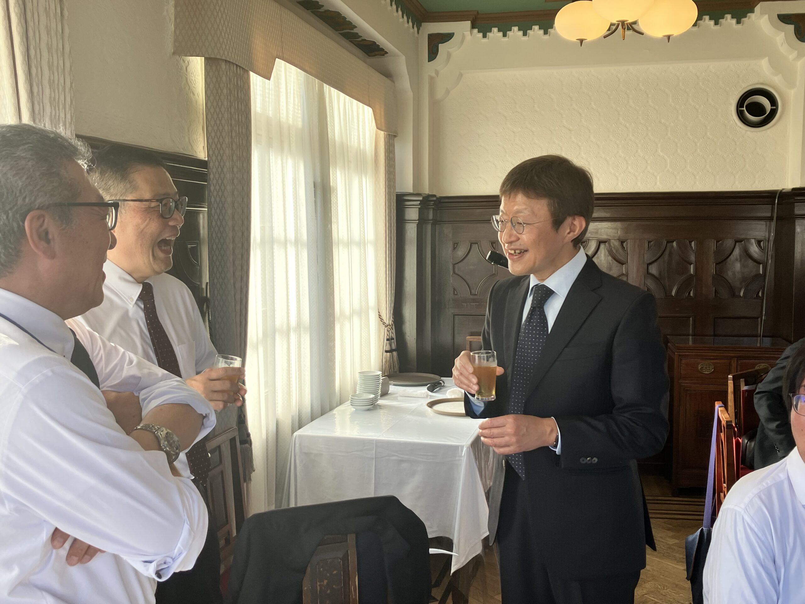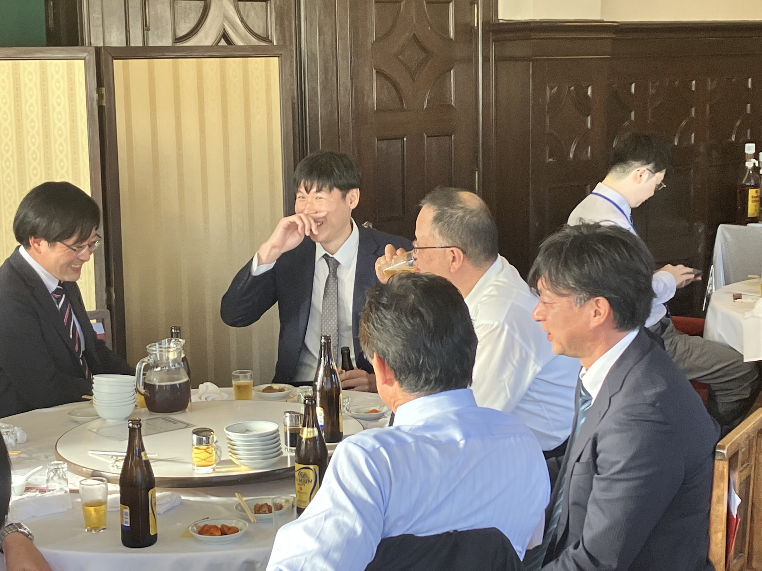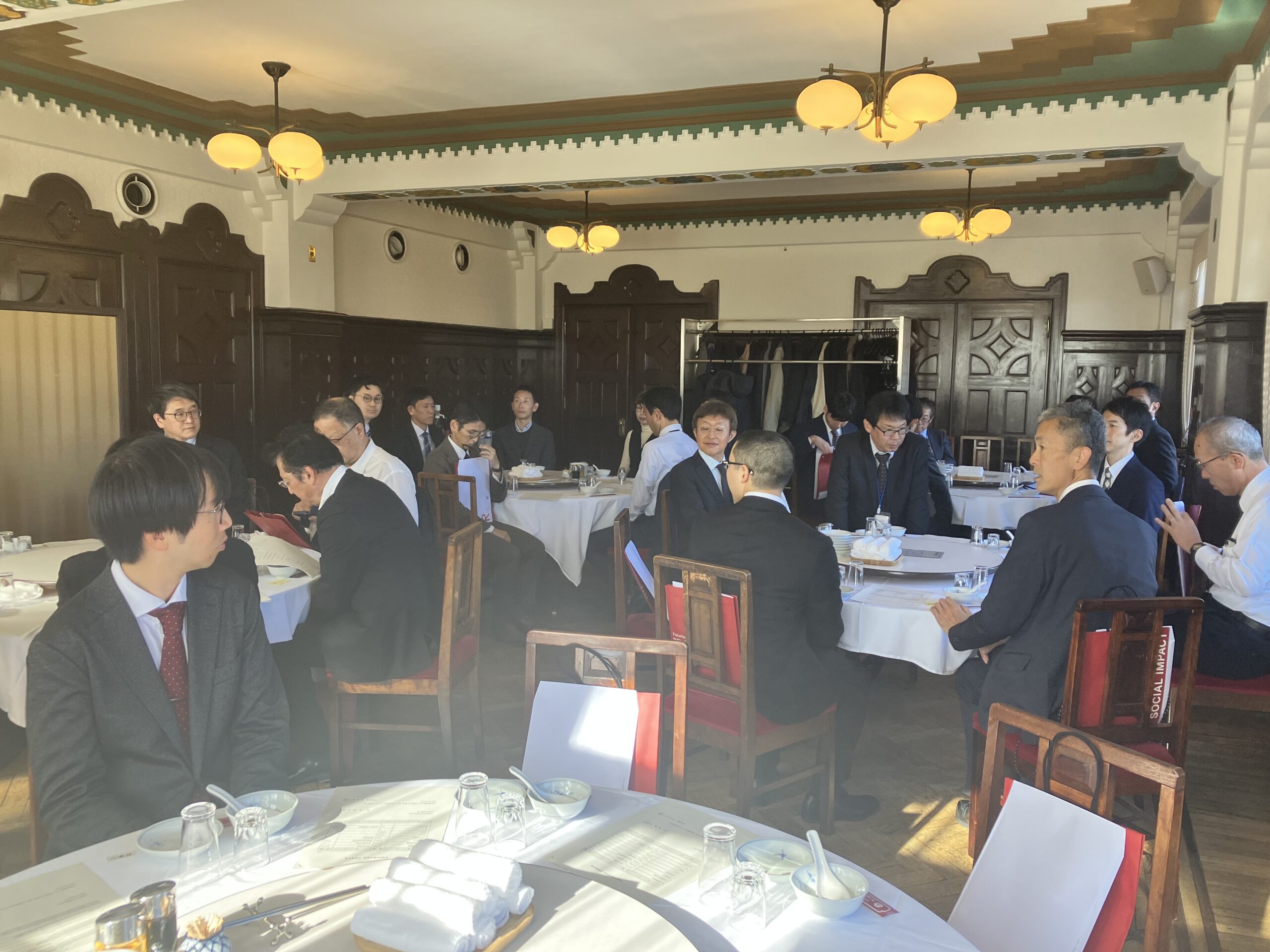 駒淳志幹事(’02理工研)の司会進行で開会した総会は、初めに橋田洋介会長(’89理工)が開会の挨拶を行い、次に校友会事務局から参加した大場が、先日2年連続で甲子園ボウルを制したアメリカンフットボール部や、明治神宮野球大会で準優勝した硬式野球部など学生たちの活躍や、2026年4月に衣笠キャンパスに設置される新学部のデザイン・アート学部・研究科の準備状況等、母校の近況を報告するとともに、さらなる支援と連携をお願いしました。その後、昨年度末をもって同会を退会された松原武司氏(’87理工)と齋藤裕二氏(’87理工)が紹介され、橋田会長から記念品が贈呈されました。そして同会を通じて構築できた人脈が、仕事をしていくにあたって様々な協力を得られたことなど、思い出話を交えながらそれぞれ挨拶を行いました。最後に、決算報告等の総会議事の承認を経て、総会を終了。懇親会へと移行しました。