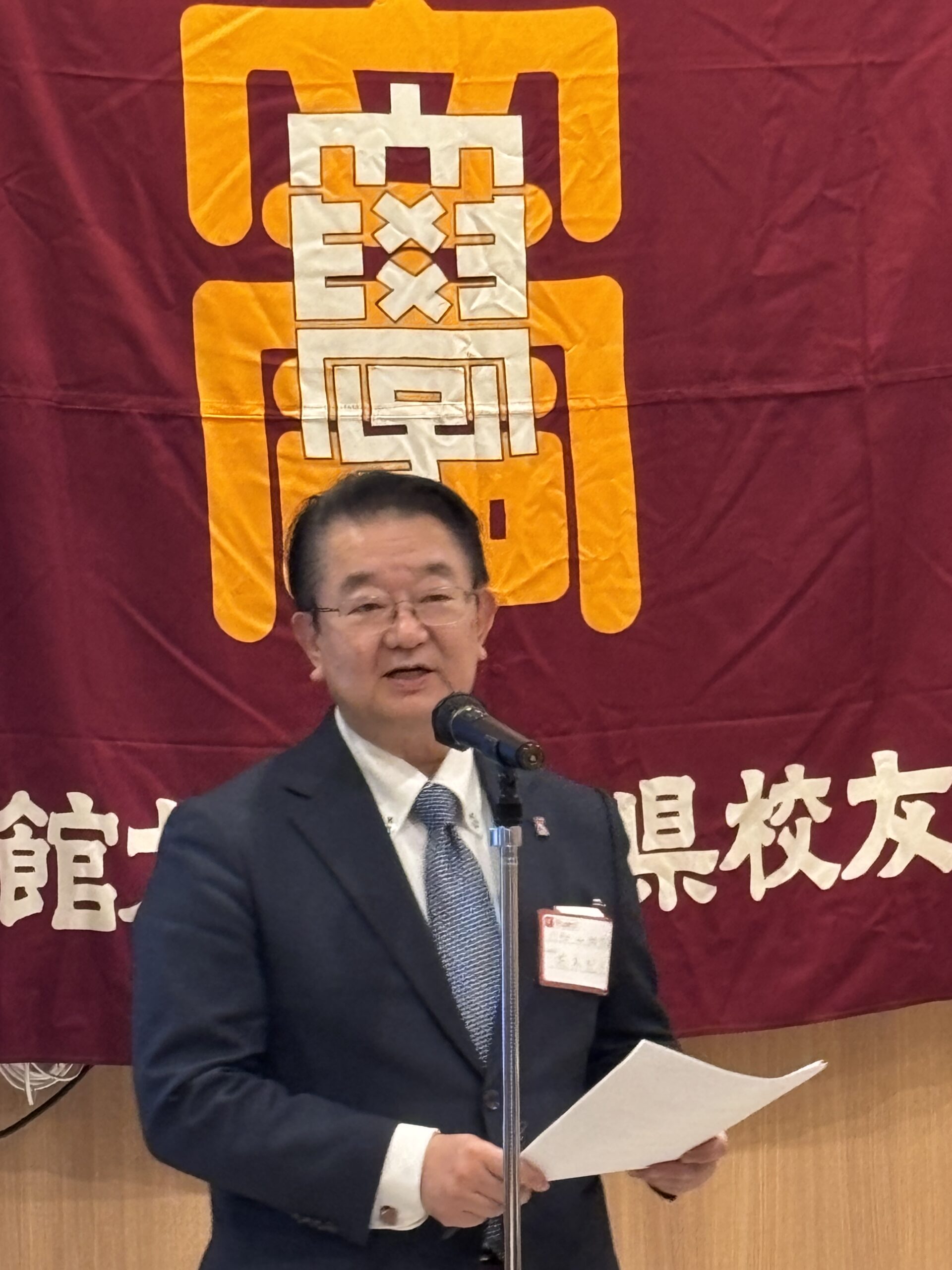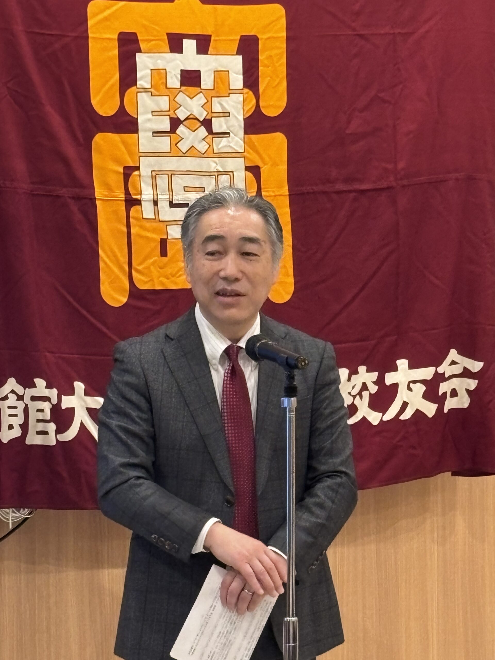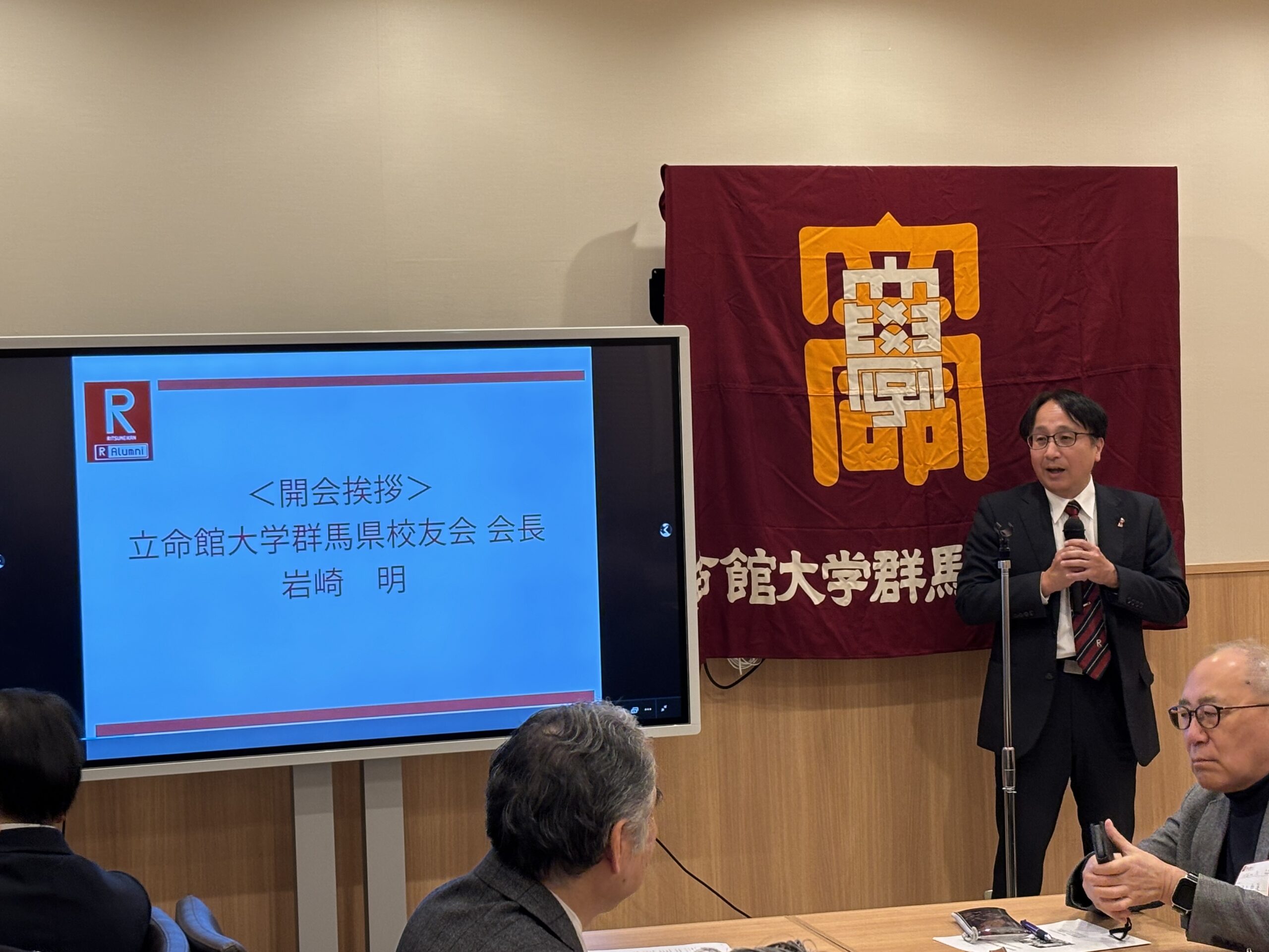 続いて立命館大学校友会の茨木紀夫副会長がご挨拶に立ち、校友会未来人財育成基金の歴史や最新の実績等を詳しくご紹介され、群馬県校友会のご協力に対して深く感謝を述べられた。今日は未来人財育成基金のおかげで積極的な活動を推進できている学生達がこの後に登場するので、ぜひその報告に耳を傾けてほしいと強調された。また現在開催中のミラノ・コルティナ冬季五輪にフリースタイルスキー・男子モーグルの日本代表として出場する藤木豪心選手('22政策)の話題も最新トピックスとして触れられ、今後も大学・学生・校友の三位一体により厳しい時代を乗り越える必要があり従前以上の幅広いご理解とご支援を、と強調された。
