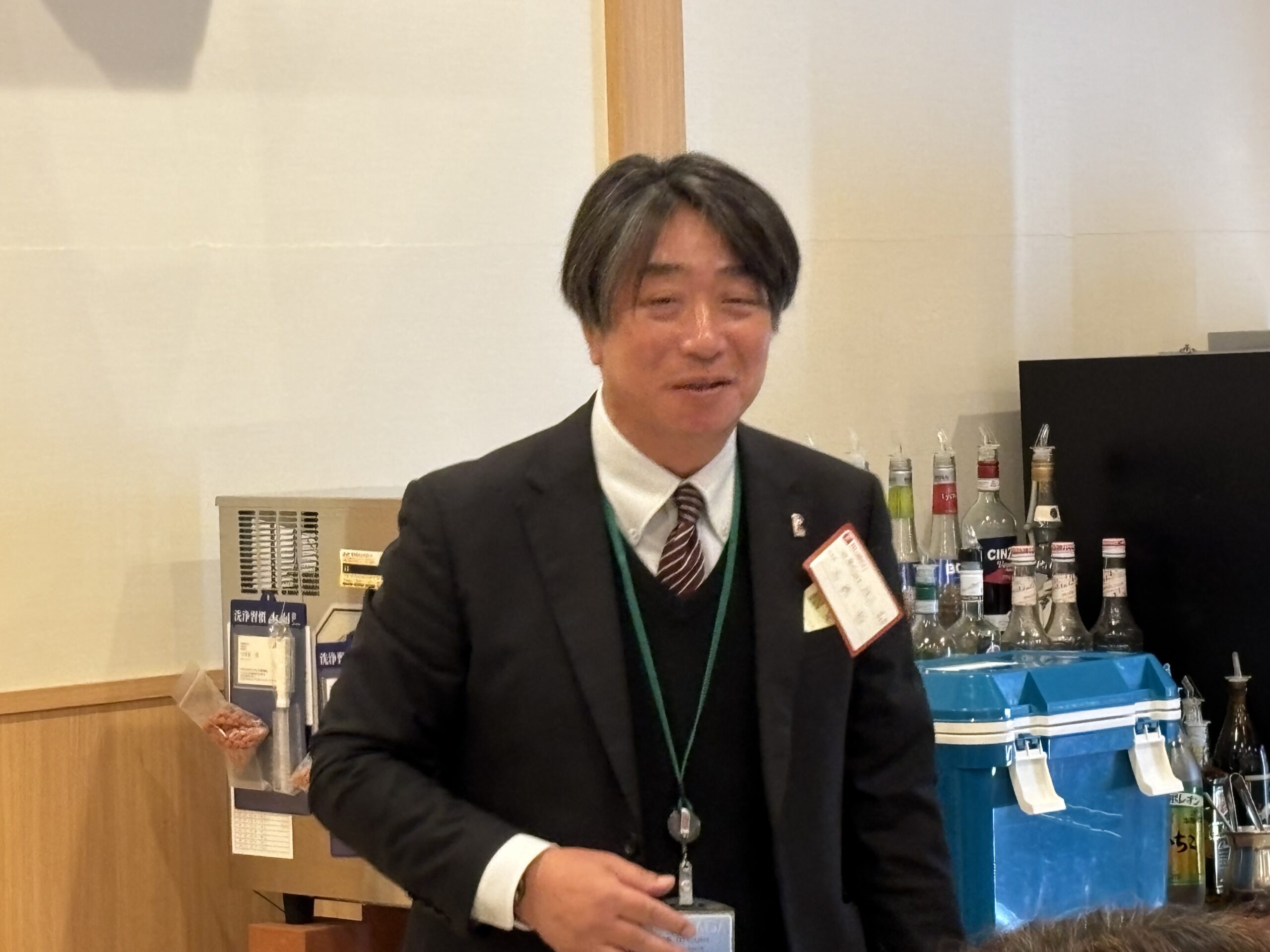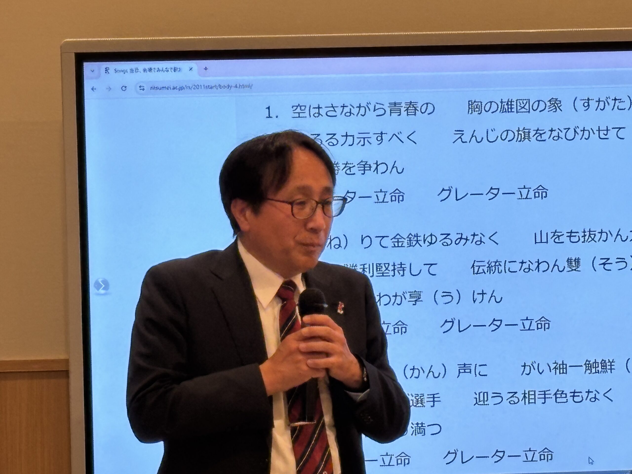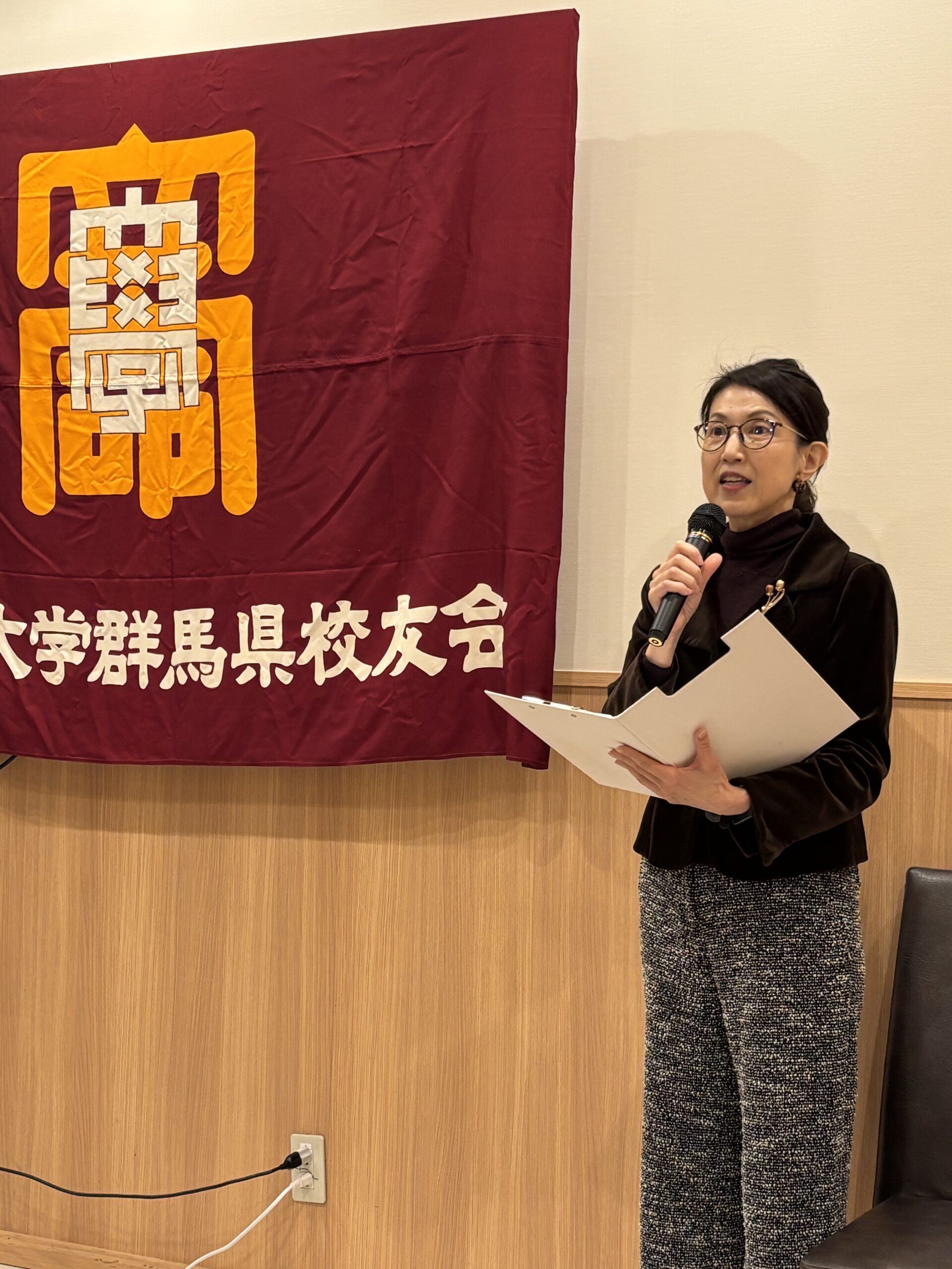 続いて立命館大学校友会の茨木紀夫副会長がご挨拶に立ち、校友会未来人財育成基金の歴史や最新の実績等を詳しくご紹介され、群馬県校友会のご協力に対して深く感謝を述べられた。今日は未来人財育成基金のおかげで積極的な活動を推進できている学生達がこの後に登場するので、ぜひその報告に耳を傾けてほしいと強調された。また現在開催中のミラノ・コルティナ冬季五輪にフリースタイルスキー・男子モーグルの日本代表として出場する藤木豪心選手('22政策)の話題も最新トピックスとして触れられ、今後も大学・学生・校友の三位一体により厳しい時代を乗り越える必要があり従前以上の幅広いご理解とご支援を、と強調された。