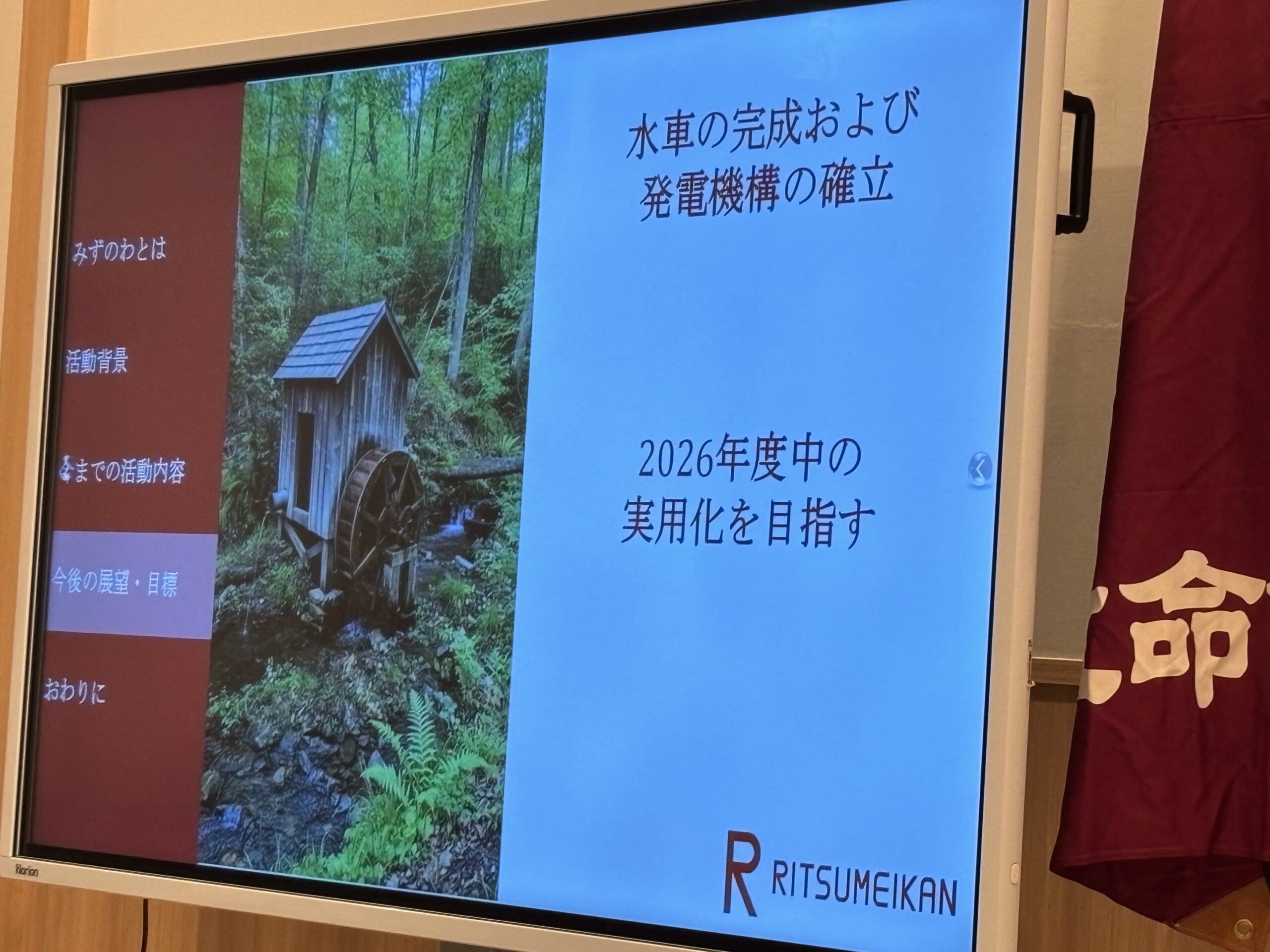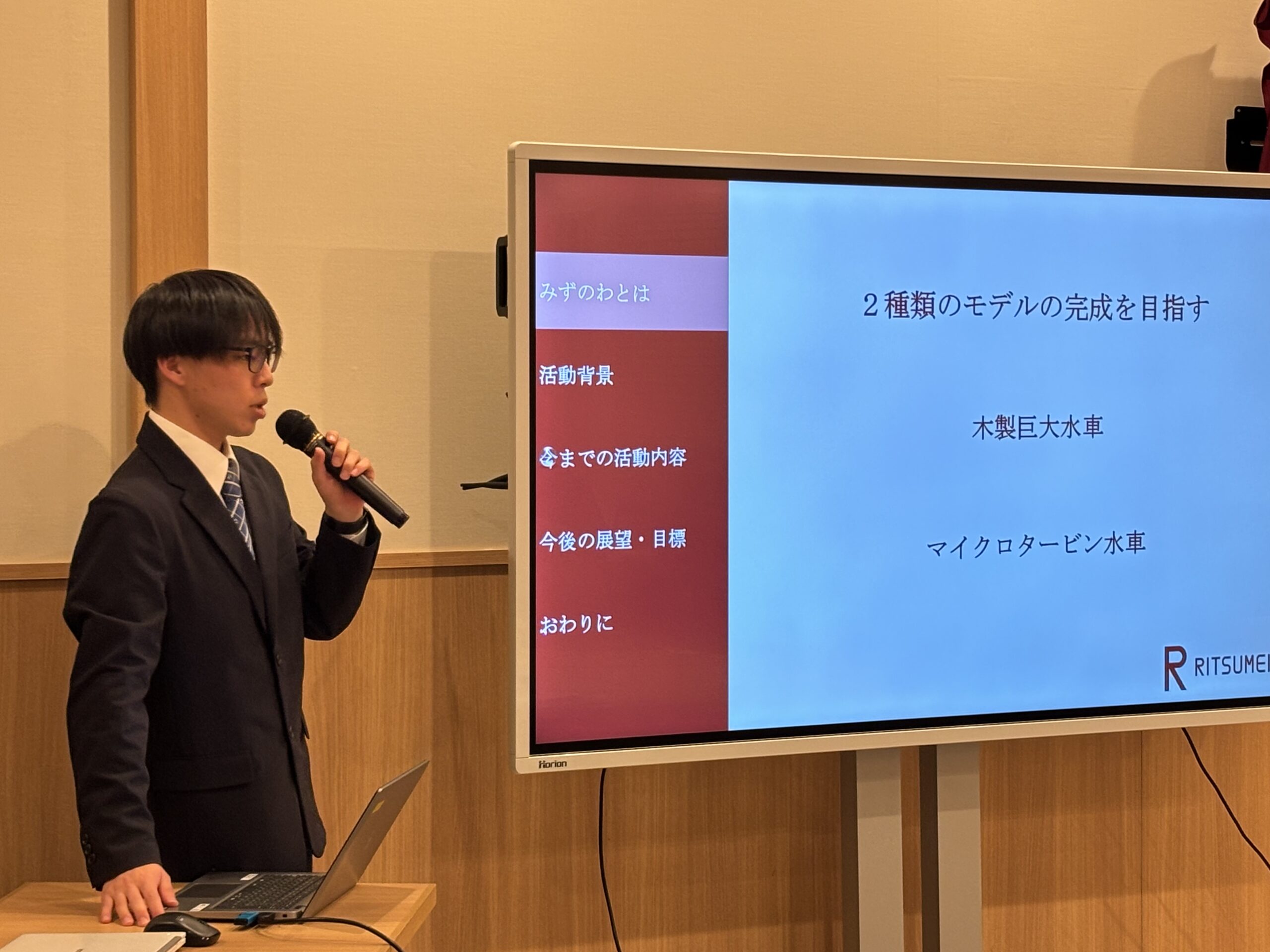 次に校友会未来人財育成基金の支援団体活動報告の前に、岩崎会長から未来人財育成基金は群馬県として個人・団体・法人を含めて100万円を超えたことがご報告され改めて感謝の言葉を述べられた。そして「みずのわ」の理工学部3回生の男子学生2名が「群馬県片品村での自然環境保護の視点に立ったマイクロ水力発電所」のテーマでマイクを握った。片品村エコロヴィレッジでの小水力発電推進のための事業紹介等を熱心に詳しく報告、将来のエネルギー環境を構築できる展望のある濃い内容に参加者は耳を傾け会場から温かい拍手が送られた。