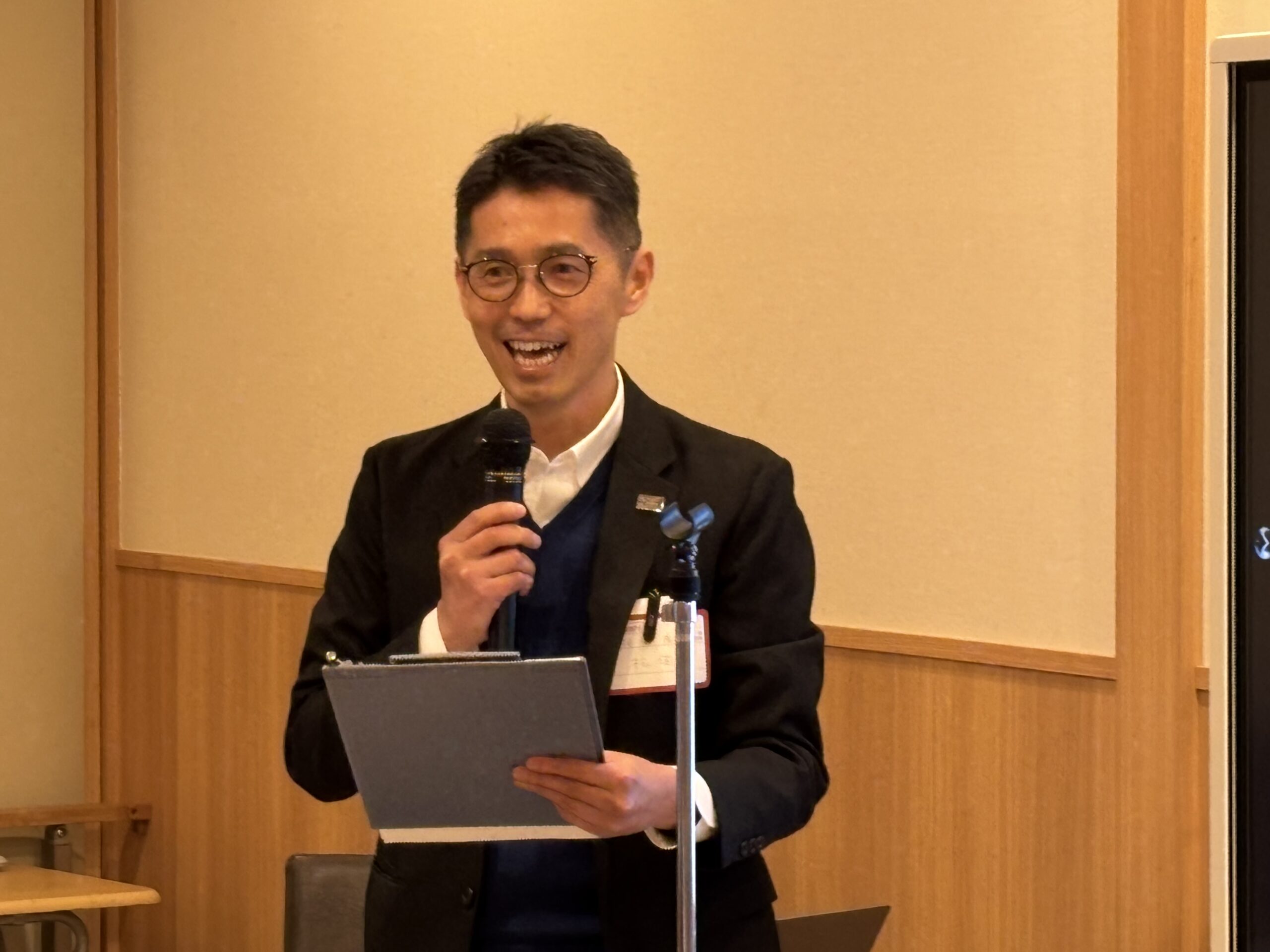 総会では岩崎会長が議事を進められ、第1号議案として2025年度事業報告と会計報告、2026年度事業計画を一括してご報告され拍手をもって承認された。会計報告の中では通信費のやりくりについて触れられ、総会に向けた県内の校友へのご案内は葉書とEメールを活用しているが、今後は諸々創意工夫していきたいので、またお知恵を頂戴したいと呼びかけられた。