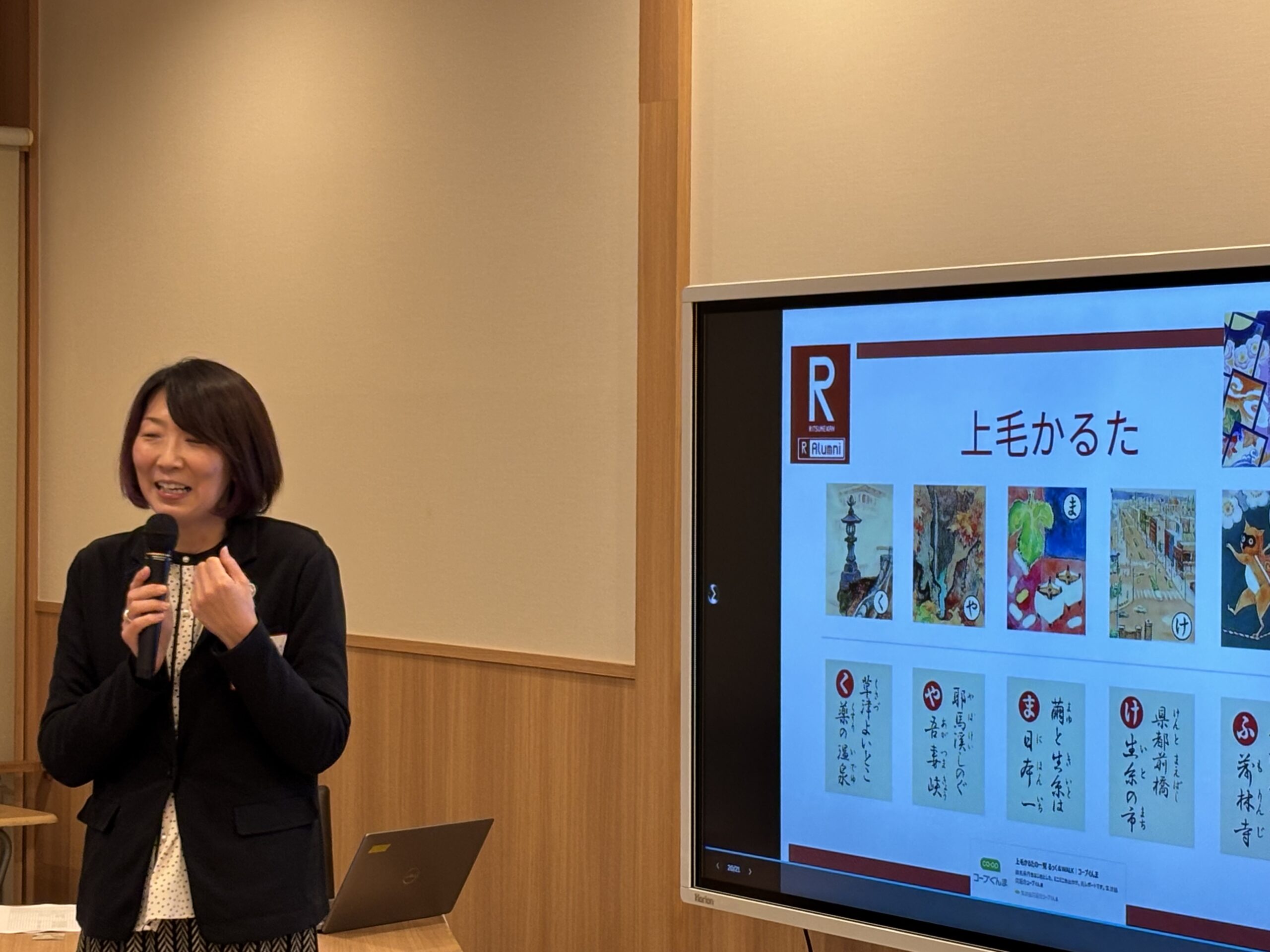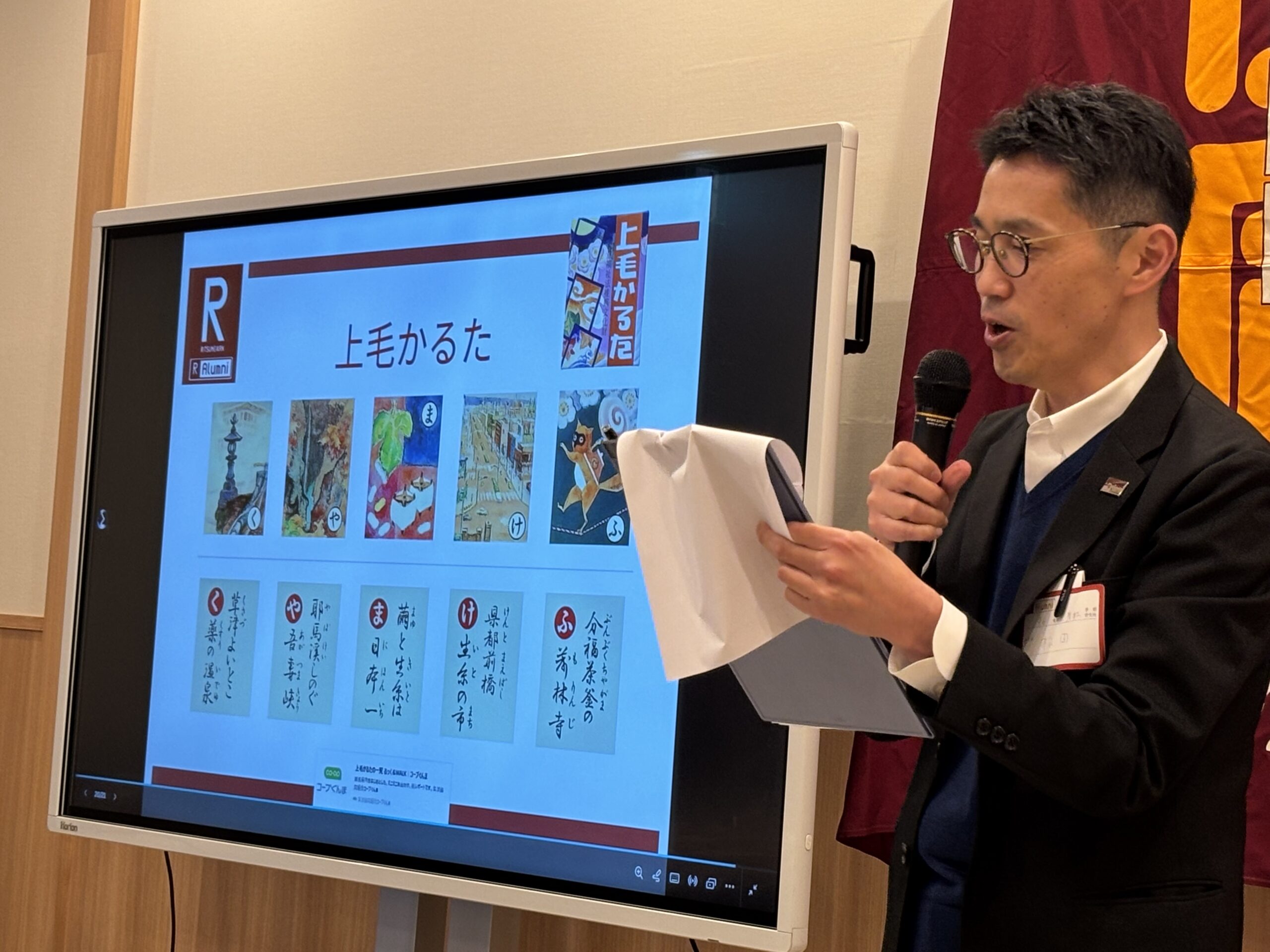 第三部の懇親会は松田研幹事長('96産社)が司会進行と務め、栃木県校友会の江田聡副会長兼幹事長のご挨拶と高らかな乾杯発声により開宴となった。会話も弾み、笑顔と笑い声に包まれる中、群馬県の歴史・自然・人物・地理・産業・風物等が絵札になっている上毛かるたを活用したお楽しみ抽選会が始まった。会場スクリーンに映し出される上毛かるたについて早乙女恵氏(’97産社)が、読み手として読み札の裏に書かれている文言を抑揚つけながら読み上げ、参加者は会場受付で手渡された絵札の文字と合致するか固唾をのんで見聞きする。手元にある絵札の文字が映し出され読み上げれると大きな拍手に包まれながら景品台まで足を運ぶ、という魅力一杯の企画で会場の熱気は一気に高まった。