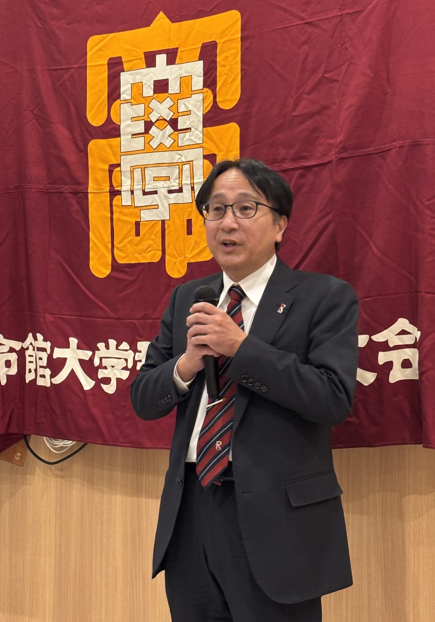 来賓祝辞では、学校法人立命館の高山茂副総長が冒頭で群馬県校友会の発展に向けた岩崎会長のご尽力に重ねて敬意を表され、未来人財育成基金をはじめ県校友の皆様へ謝辞を述べられた。近況では昨年の立命館創始155年・学園創立125周年記念式典・記念イベント、オール立命館校友の集い2025に触れられ、とくに2020年3月の卒業生・修了生を対象にした2019年度リユニオン卒業式の学内外からの高い評価についてご紹介された。またスポーツや文芸分野での学生・卒業生の活躍、各キャンパスの近況等を詳しくご報告。難関の国家公務員総合職試験や公認会計士試験でのめざましい合格者状況、BKCでのESEC宇宙地球探査研究センター、衣笠キャンパスに2026年4月に開設予定のデザイン・アート学部、大学院デザイン・アート学研究科、令和6年度の配分では過去最高の16億316万円という科研費等の話題には会場から歓声があがった。