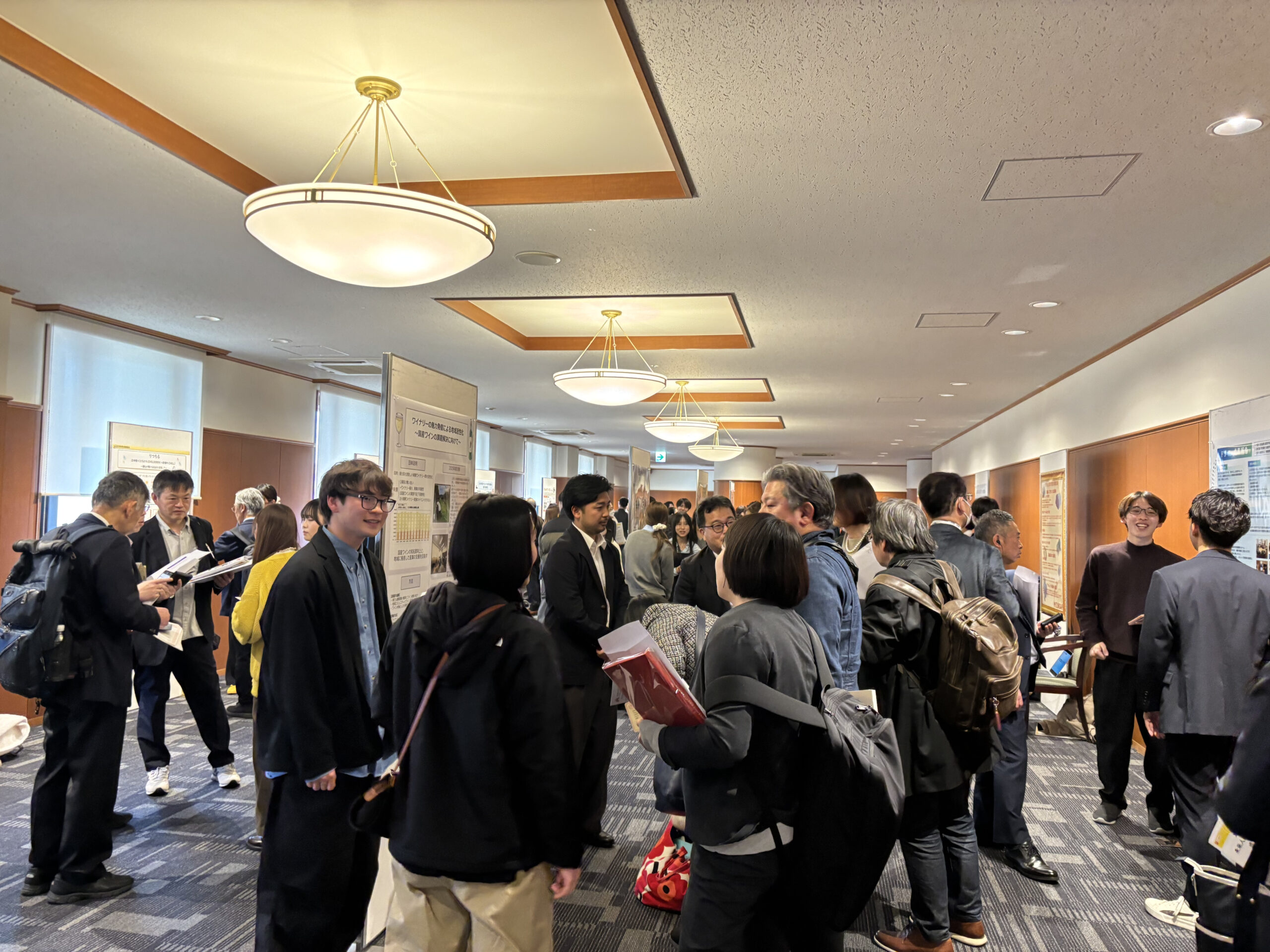 開会前の受付時間中には、ホワイエにて「校友会未来人財育成奨励金受給団体 成果発表・交流会」が、ポスターセッション形式で行われました。27もの受給団体がそれぞれの活動状況を熱心に伝え、校友からもアドバイスや質問が飛び交い、終始、校友と学生との間で活発な交流が行われました。