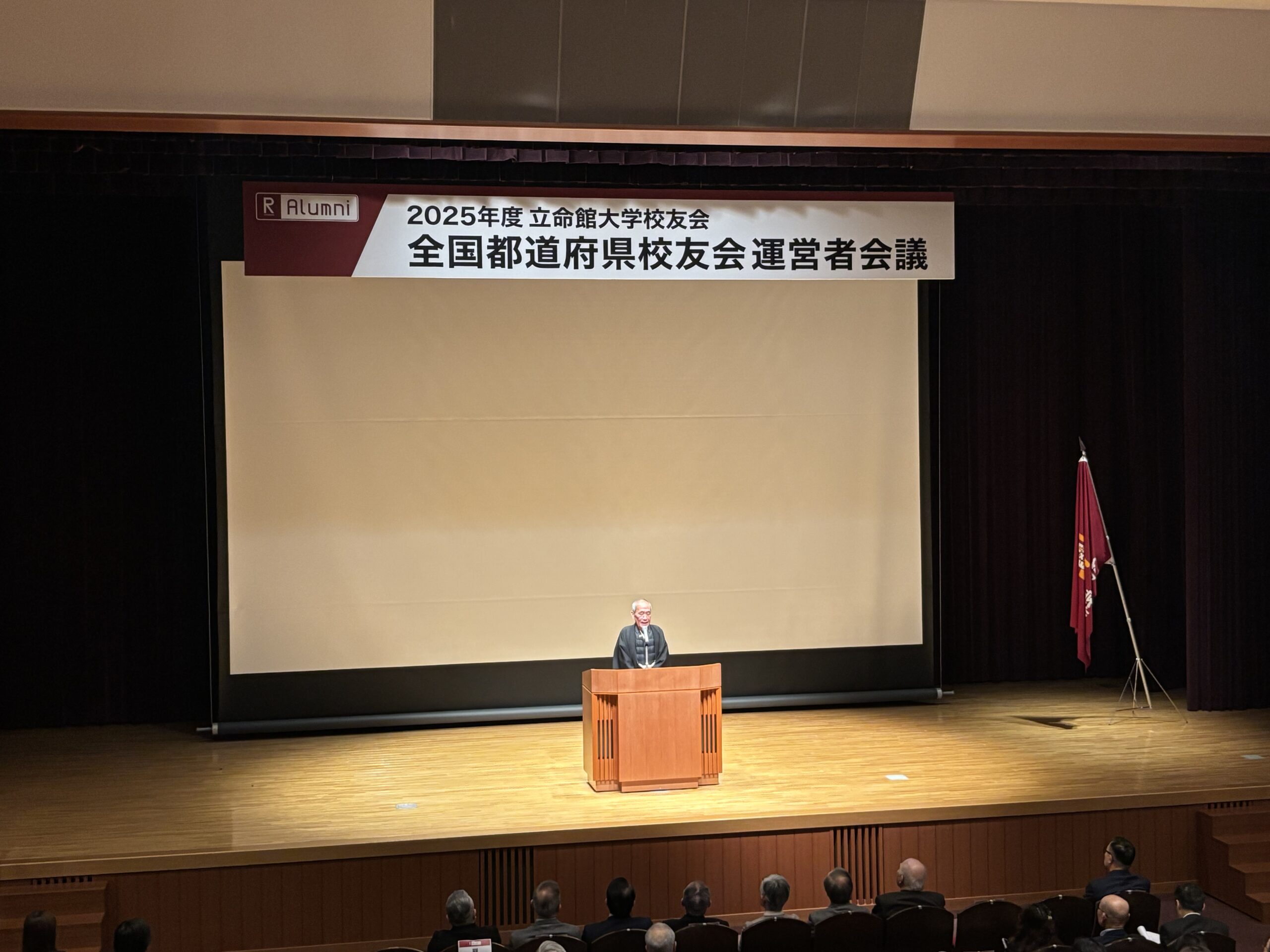校歌斉唱の後、続いて、門川大作校友会長からの開会挨拶、学校法人立命館の森島朋三理事長より来賓挨拶が行われ、全国に広がる校友ネットワークの価値、そして立命館と校友会の歴史ある深いつながりとこれからの期待について語られました。