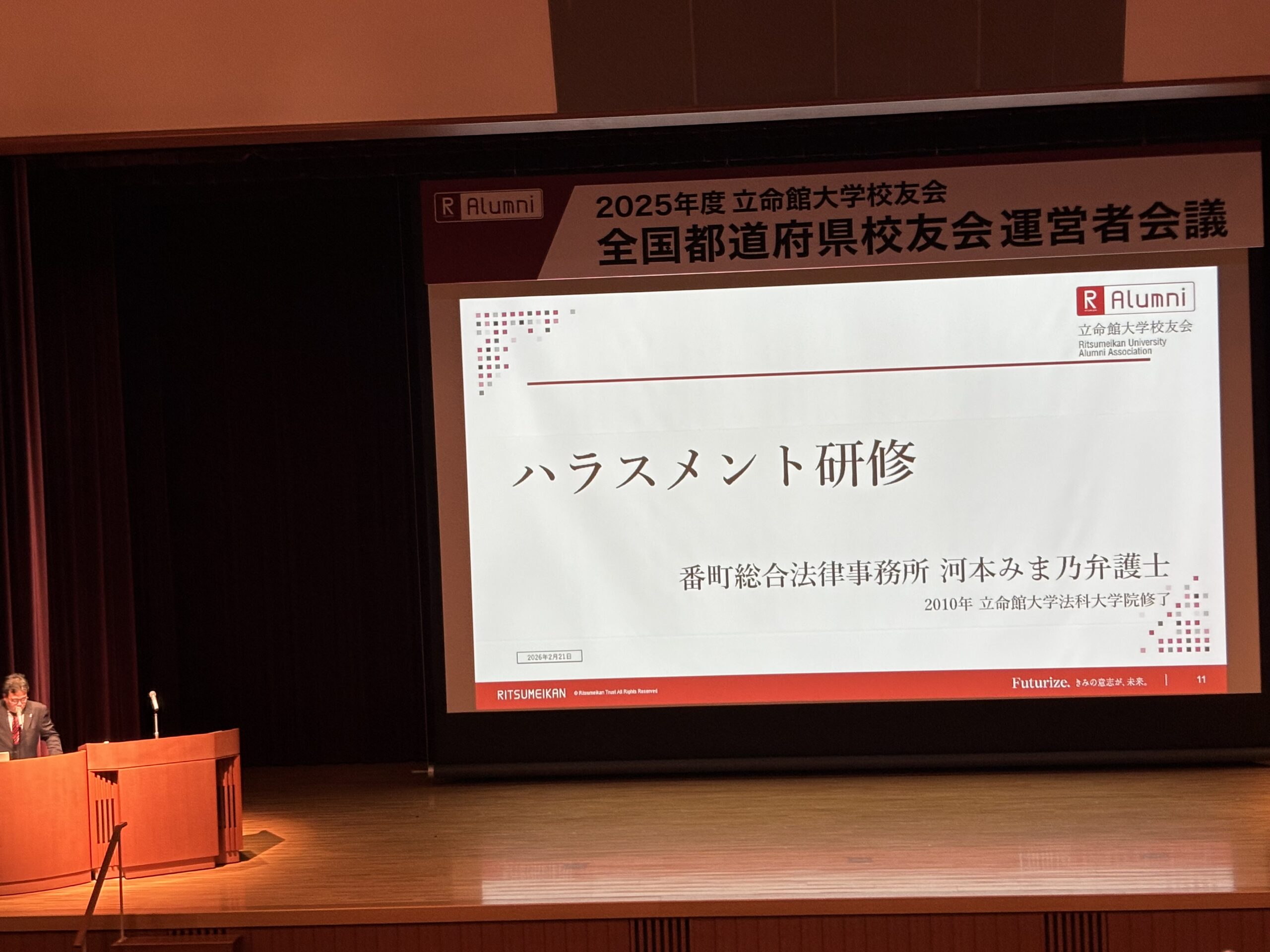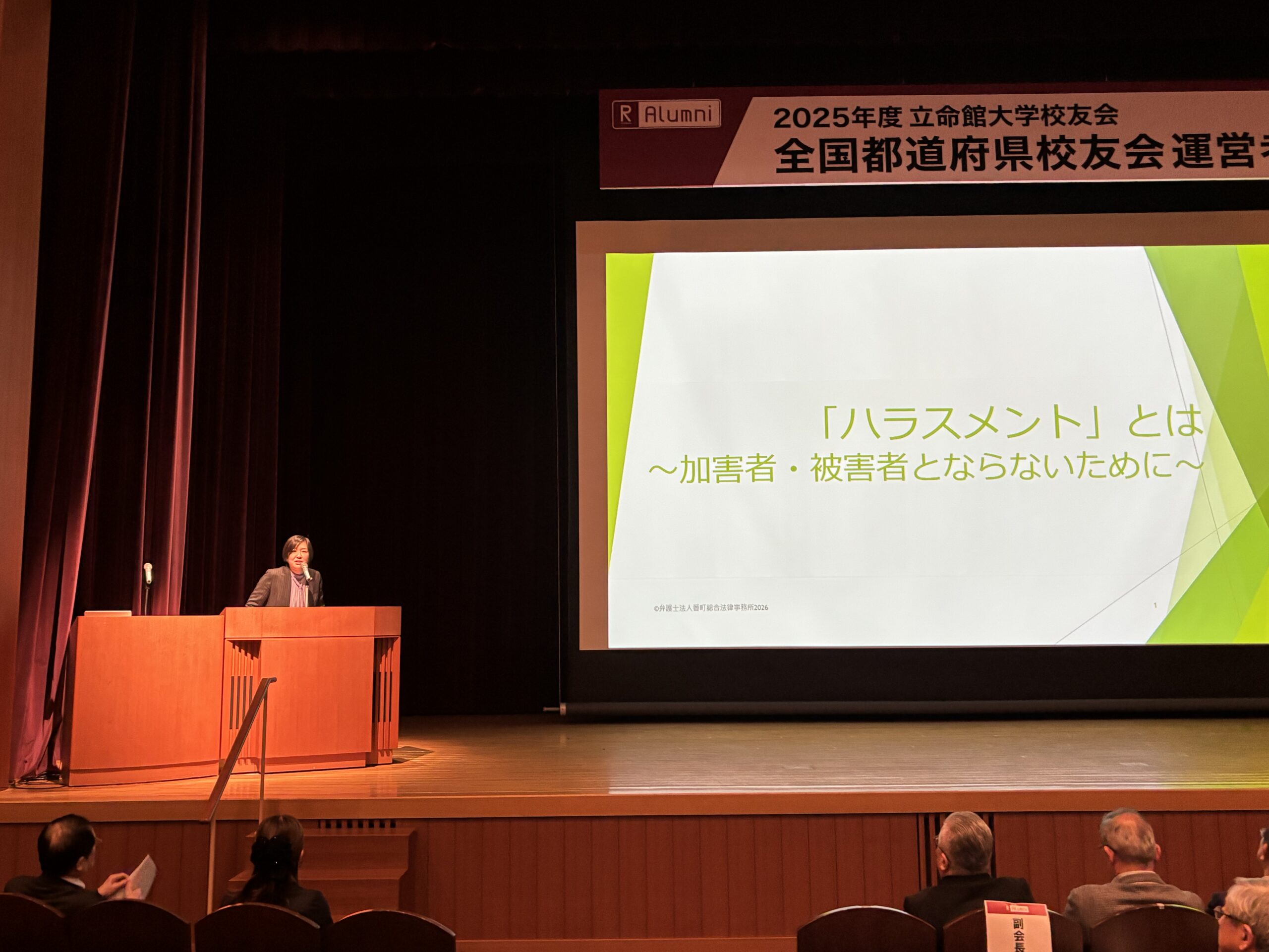 全体会の後半には、新たな取り組みとして研修の場が設けられ、「ハラスメントとは」をテーマに河本みま乃先生(2010年法務研究科修了)にご講演いただきました。都道府県校友会として活動する中で、運営者としての対応方法や組織として備えておくべき体制など、事例を交えた具体的な内容に参加者は熱心に耳を傾けていました。
