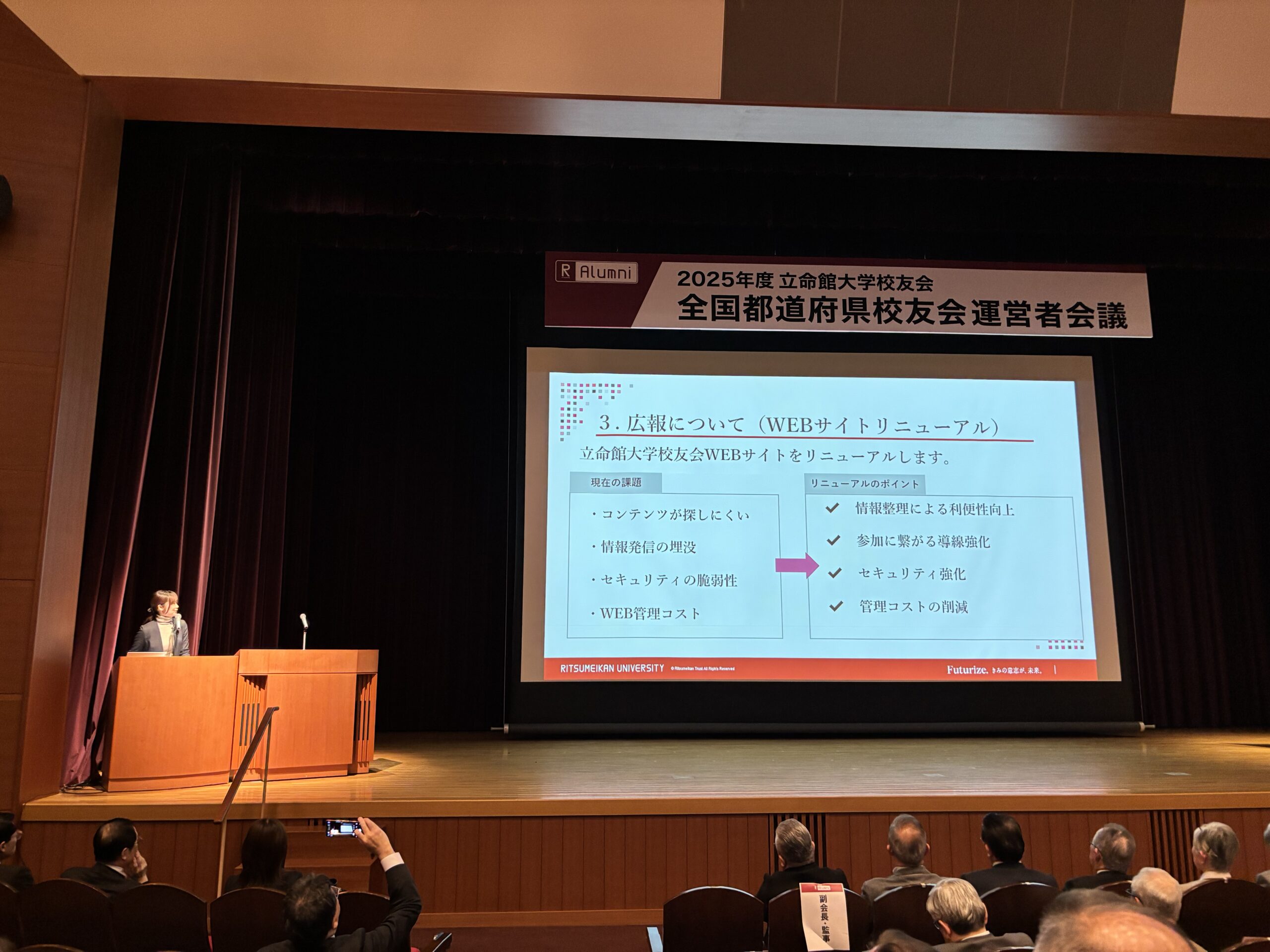 その後の事務連絡では、都道府県校友会活動に関わる各種手続きや変更点について説明が行われました。