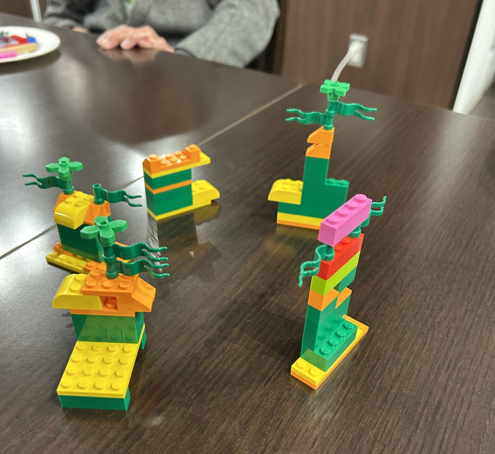 何十年ぶりに触る「レゴ」。河口氏は、まずレゴの使い方を説明し、その後、お題を提示し、参加者はそのお題に想像力を働かせ、知恵を絞りました。「決められたこのブロックでタワーを作ってください」という最初のお題に取り組むと、各メンバーの作品は様々で、順番に作成の意図を説明したり、質問したり、お互いの作品に理解を深めました。河口氏は「タワーと言っても人それぞれ、コミュニケーションが大切」と話しました。その後、「あなたが思う遠州会を表現してください」というお題にはそれぞれの立場で思い思いの校友会が表現されました。